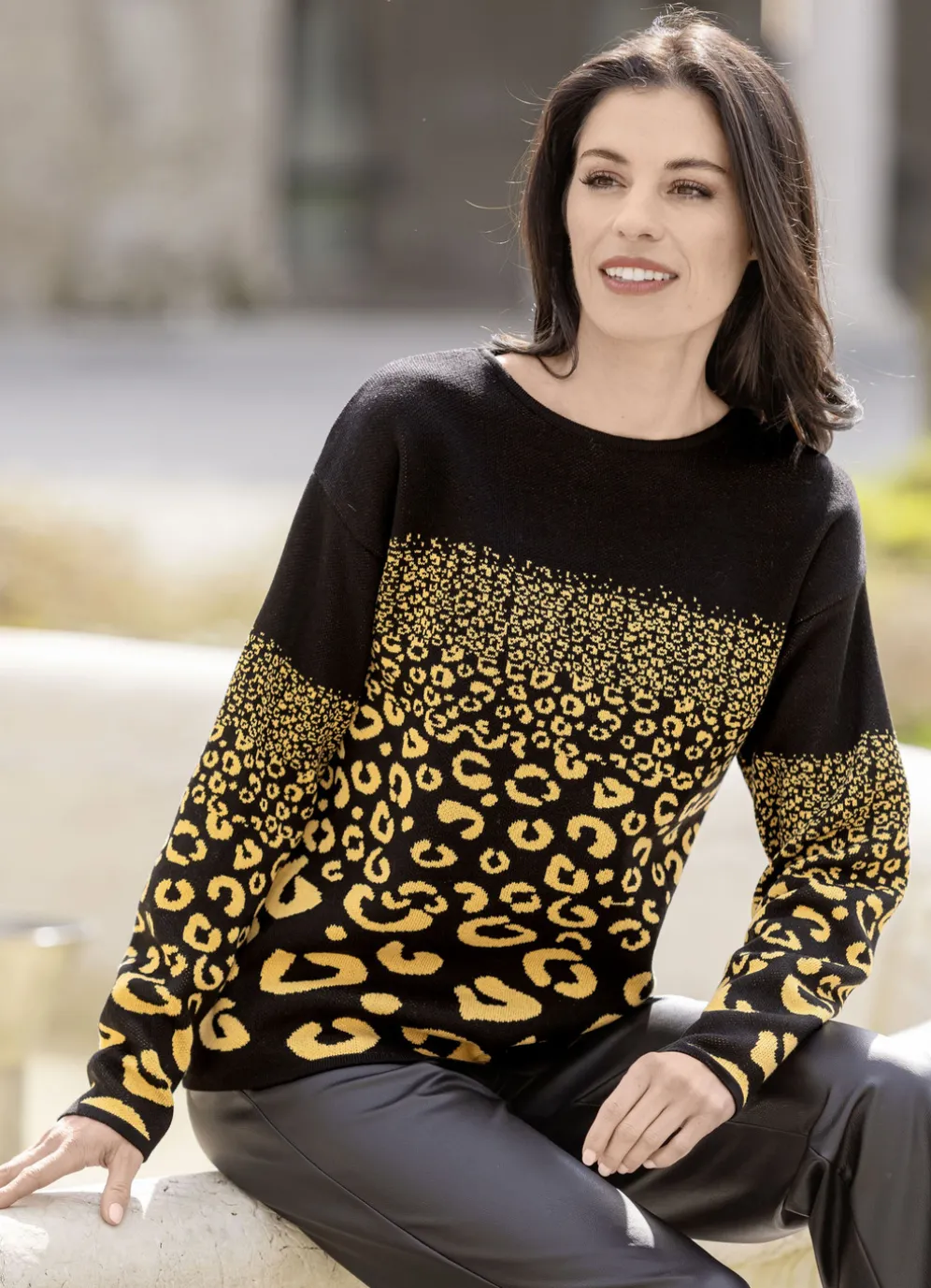 Setzen Sie einen fabelhaften Akzent mit diesem schwarz-gelben Pullover mit rundem Halsausschnitt, überschnittener Schulterpartie, ausdrucksstarkem Jacquard-Dessin in Tierfelloptik allover sowie langen Ärmeln.