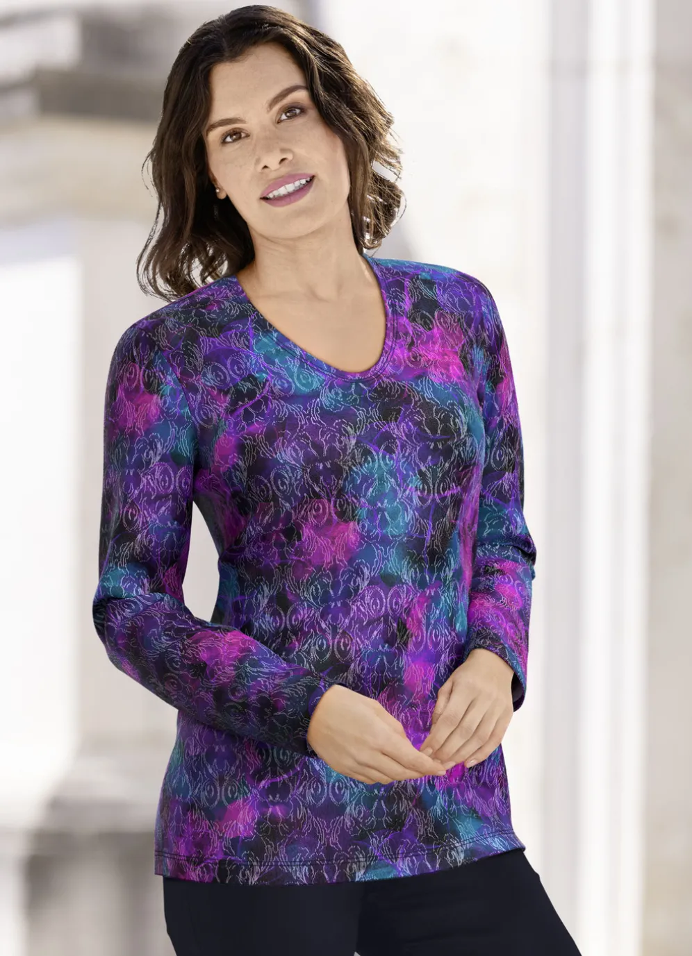 Jedes Teil ein Unikat! Pullover mit farbbrillantem Alloverdruck in Magenta-Blau-Multicolor, legerem V-Ausschnitt sowie langen Ärmeln.