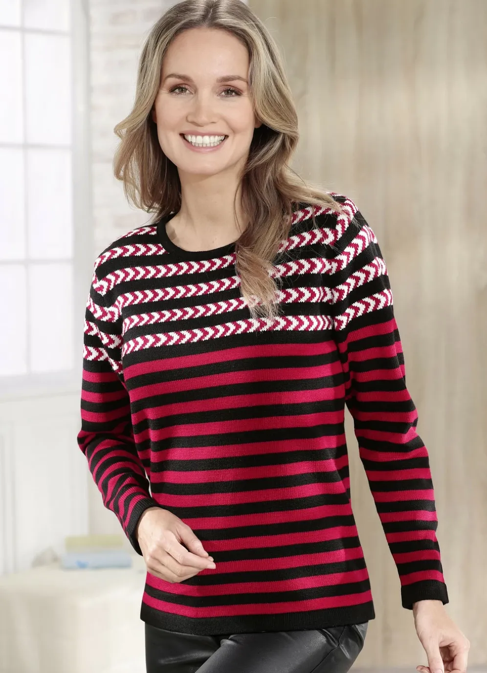 Ein absolutes Muss ist dieser Pullover in Schwarz- Rot-Weiß, mit rundem Halsausschnitt, Struktur- und Mustermix in Streifendessin mit Jacquardakzenten allover sowie langen Ärmeln.