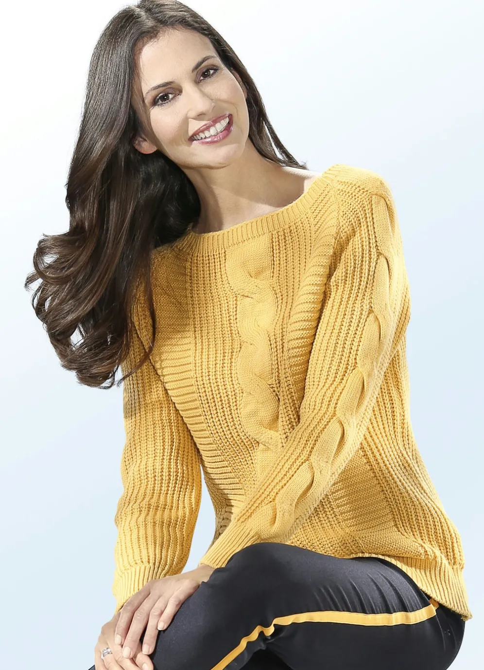 Ausdrucksstarker Pullover mit flachem Halsausschnitt, sowie dekorativem Zopf-Dessin und Strukturmuster im Vorderteil und an den langen Ärmeln.