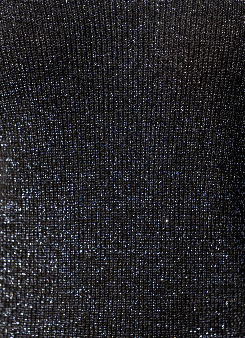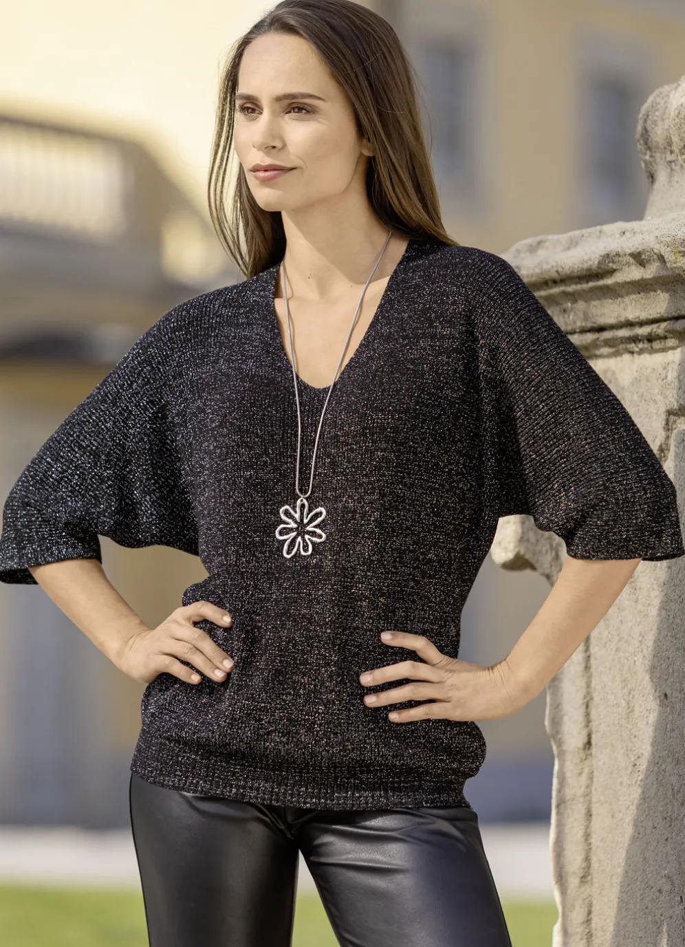 Femininer, schwarzer Pullover: V-Ausschnitt, dezentes Strukturmuster und Glitzerakzente allover, Fledermausärmel in modischer Länge, gerippter Saumabschluss.