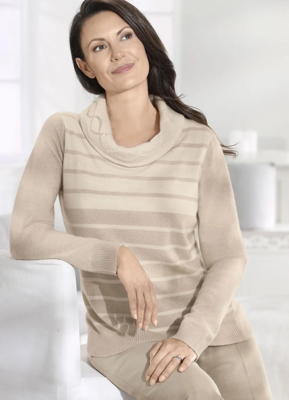 Mit viel Raffinesse ausgestattet ist dieser beige-naturfarbene Pullover mit Strukturstrick und Plättchenzier am weiten Rollkragen, Streifendessin im Vorder- und Rückteil sowie gerippten Abschlüssen an den langen Ärmeln und am Saum.