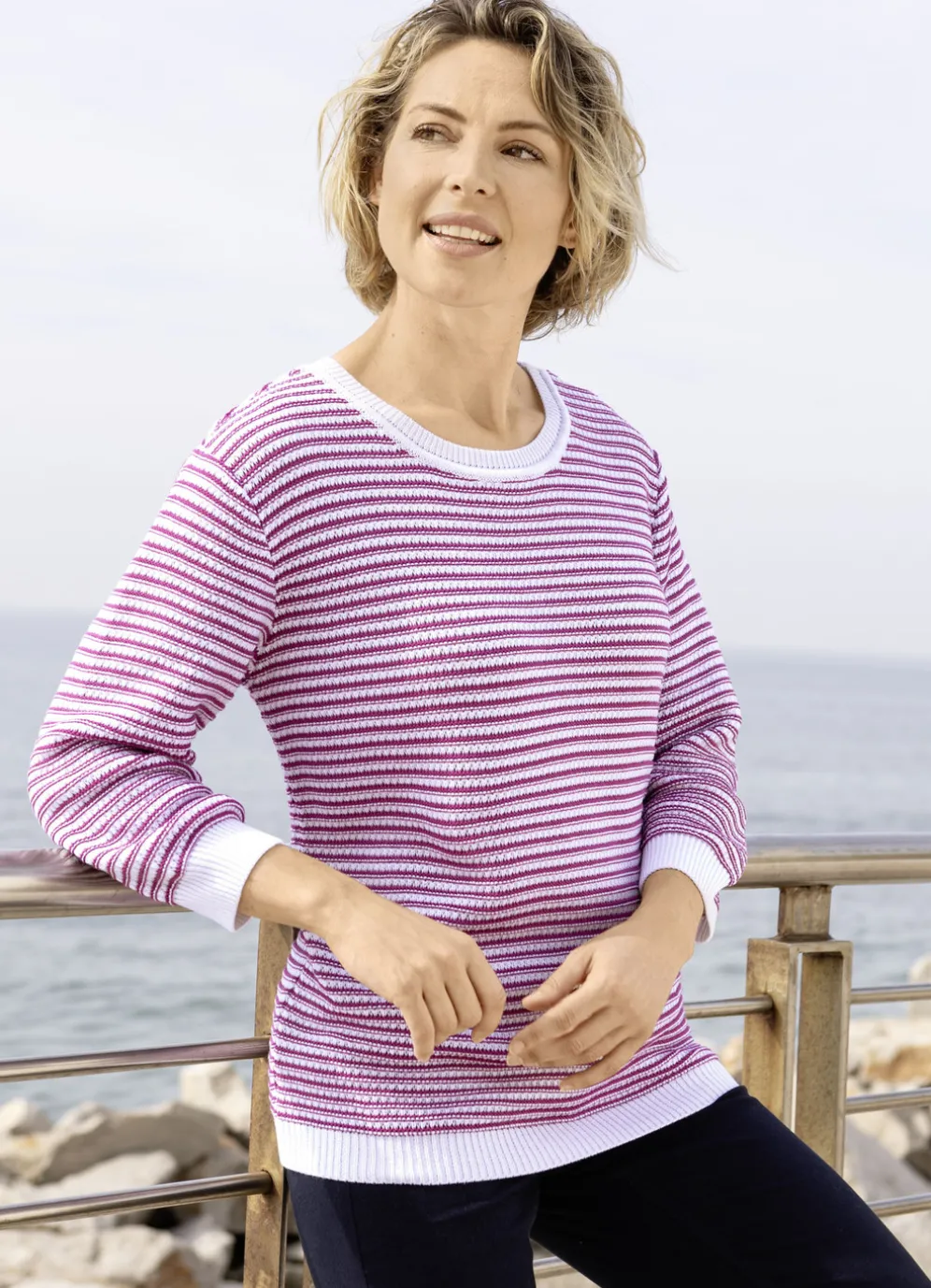 Stilsicherer Pullover mit rundem Halsausschnitt, aufwendigem Strickmix in Ringeloptik rundum, 3/4-langen Ärmeln sowie gerippten Abschlüssen in Kontrastfarben.