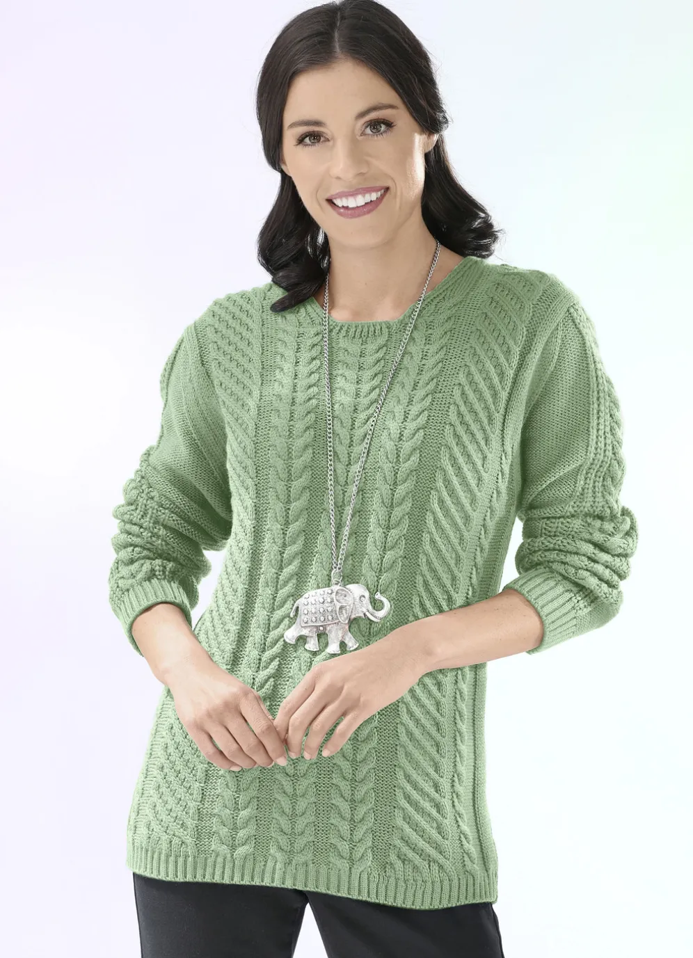 Ein Blickfang ist dieser herrliche Pullover mit hübschem, streckendem Zopfstrukturmuster allover, dekorativem, eckigem Halsausschnitt sowie Rippenabschlüssen an den langen Ärmeln und am Saum.
