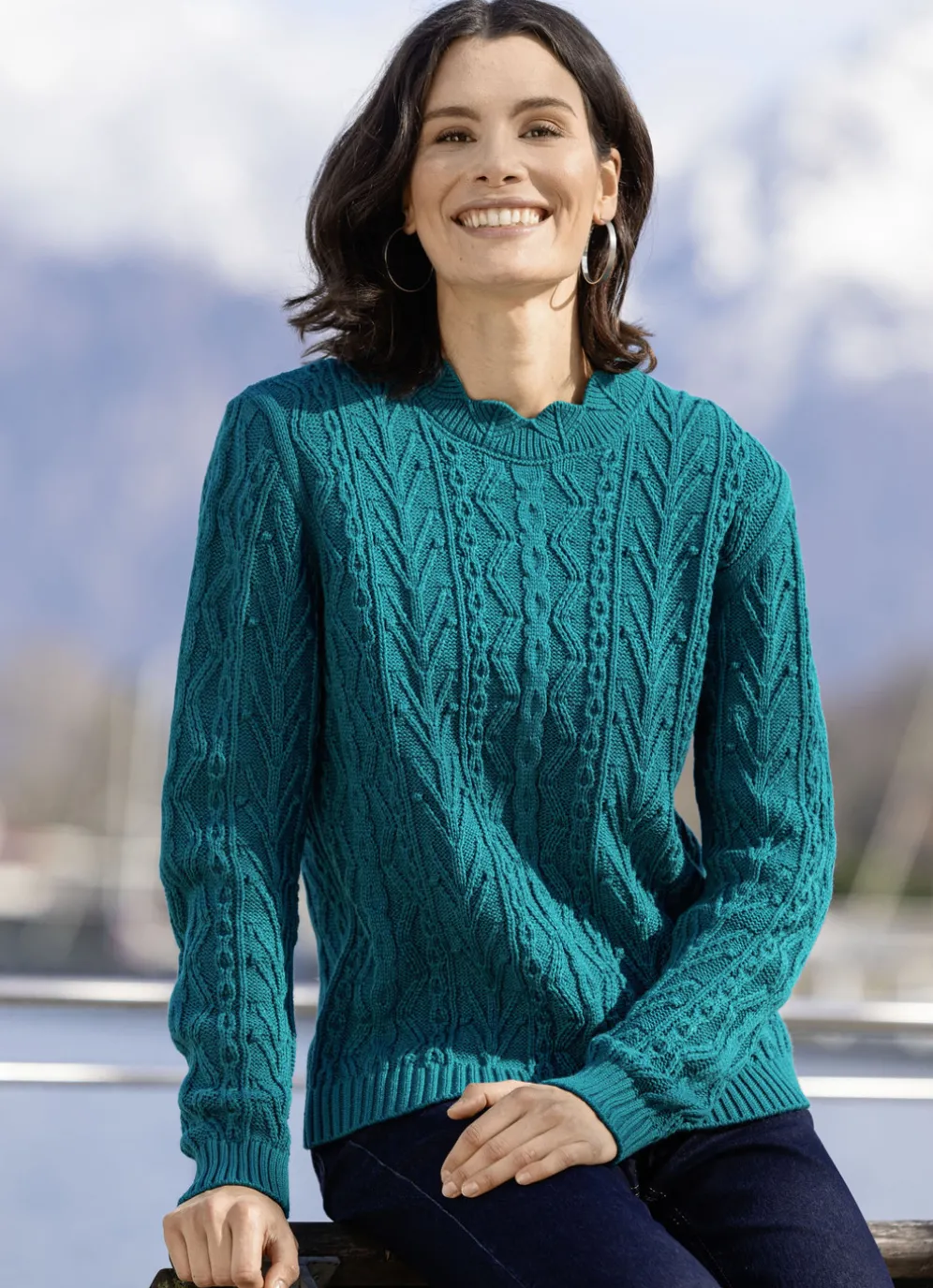 Entzückender Pullover mit aufwendigem Strukturmustermix allover, rundem Halsausschnitt mit dekorativem Abschluss sowie Rippenbund an den langen Ärmeln und am Saum.