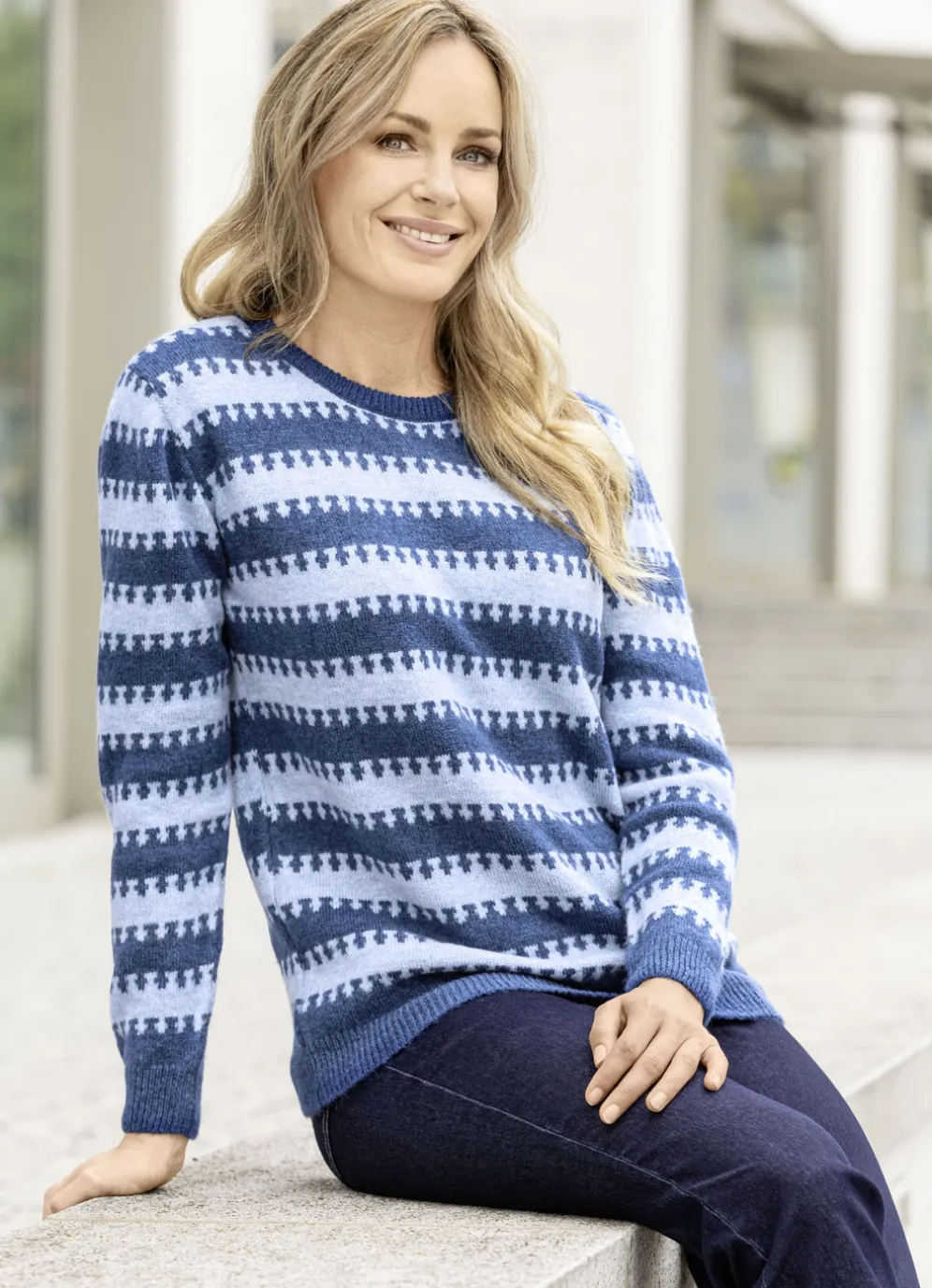 Pullover mit rundem Halsausschnitt, originellem Streifendessin in Marine-Bleu meliert allover, langen Ärmeln sowie gerippten Abschlüssen.