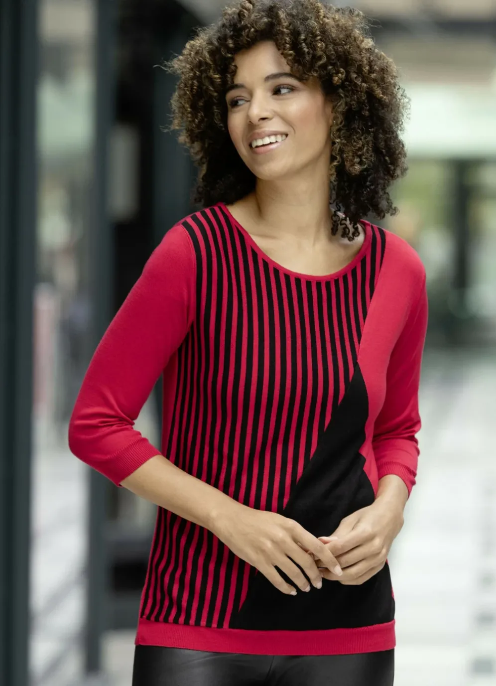 In weicher Qualität und mit dezentem Glanz zeigt sich dieser schöne Pullover in Rot-Schwarz, mit etwas weiterem, rundem Halsausschnitt, streckendem, grafischem Mustermix im Vorderteil sowie 3/4-langen Ärmeln.