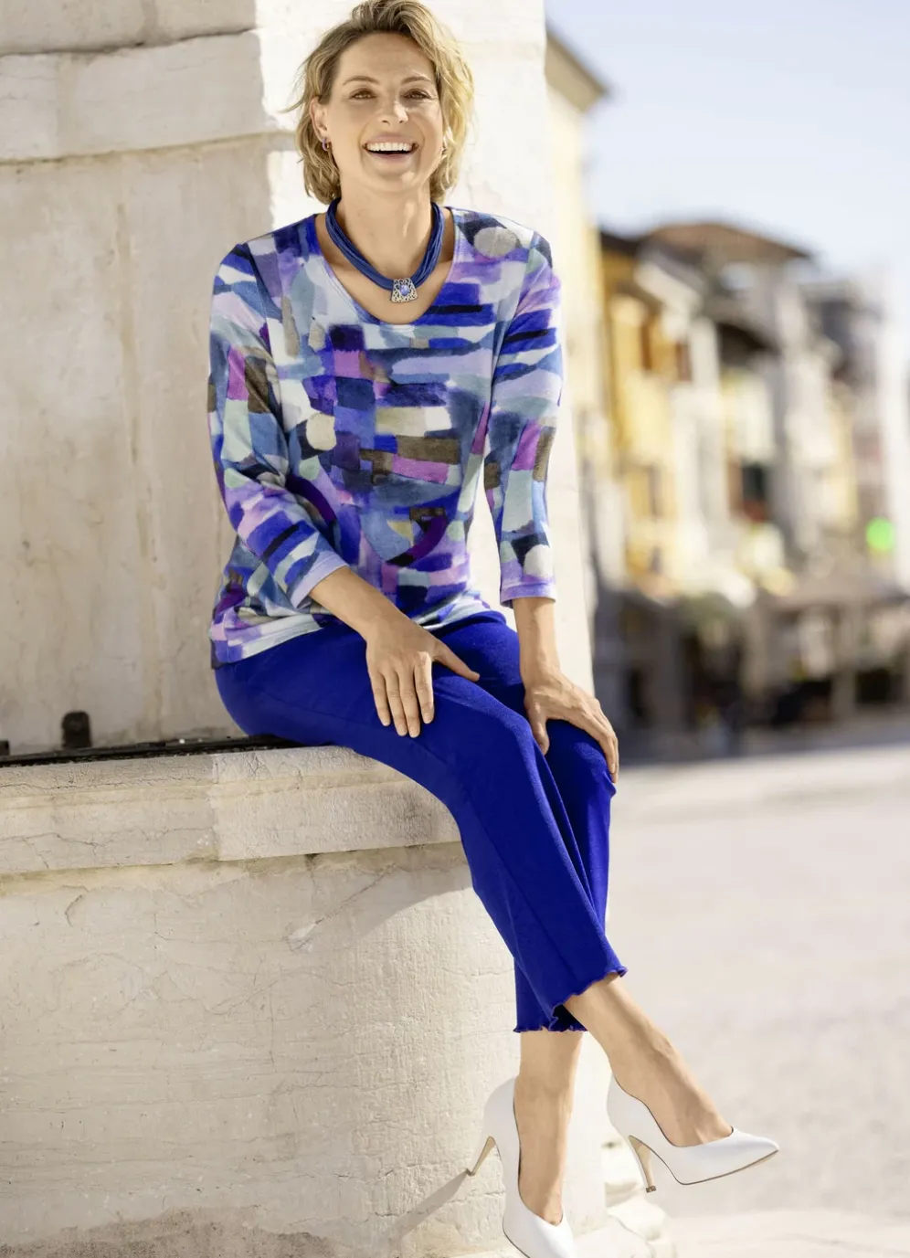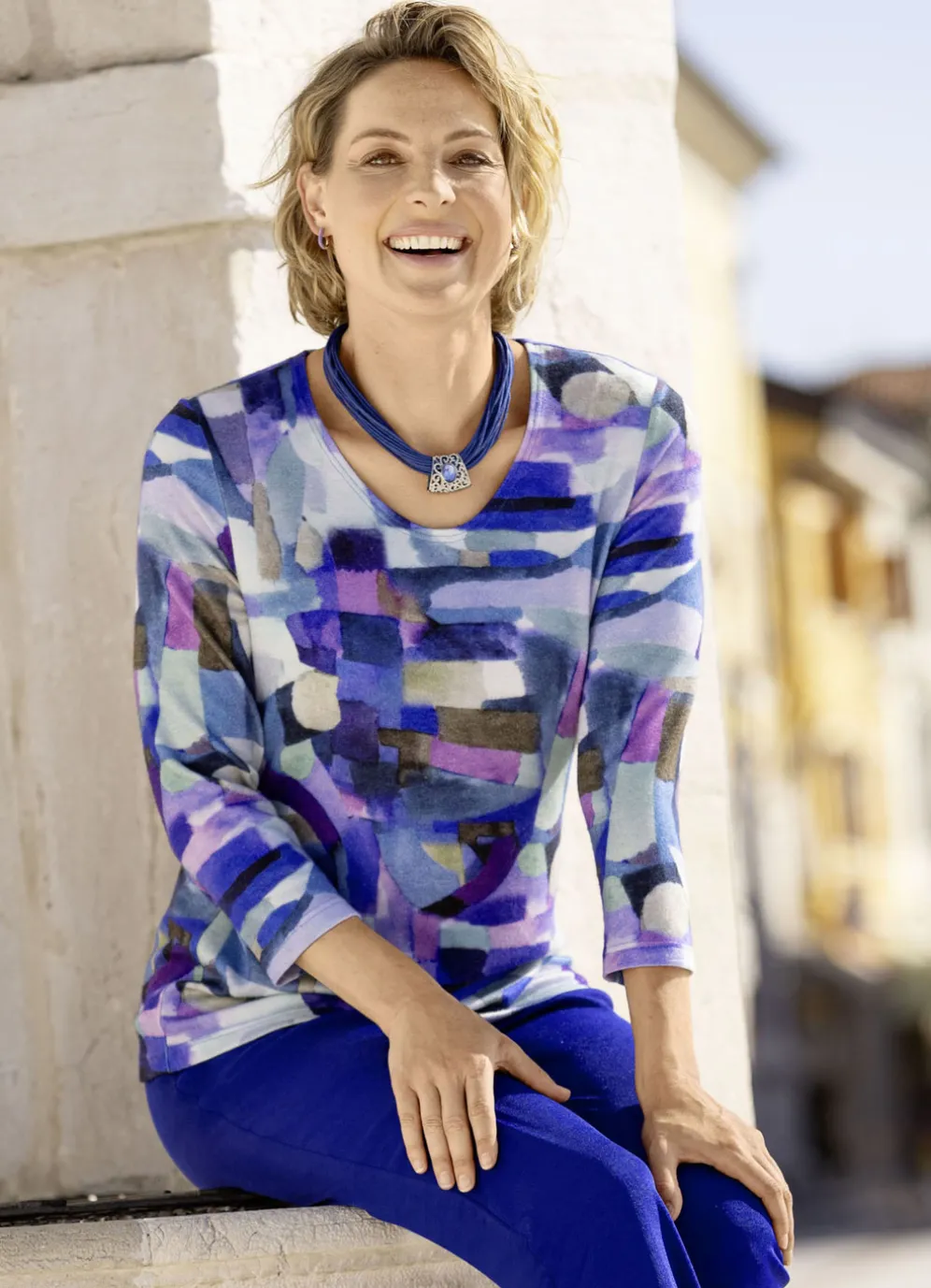 Jedes Teil ein Unikat! Pullover mit farbbrillantem Alloverdruck in Blau-Lila-Multicolor, rundem Halsausschnitt sowie 3/4-langen Ärmeln.