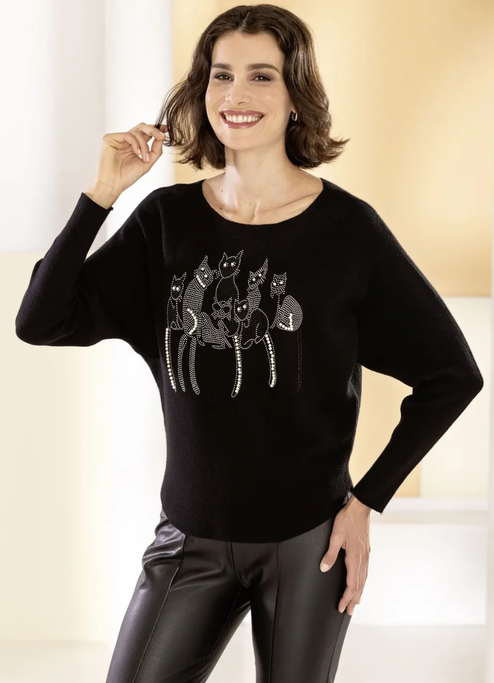 Ein extravaganter Begleiter ist dieser schwarze Pullover mit weichem Griff, flachem, rundem Halsausschnitt, aufwendigen Katzenmotiven aus Plättchen- und Perlenzier im Vorderteil, langen Fledermausärmeln sowie abgerundetem Saum im Vorder- und Rückteil.