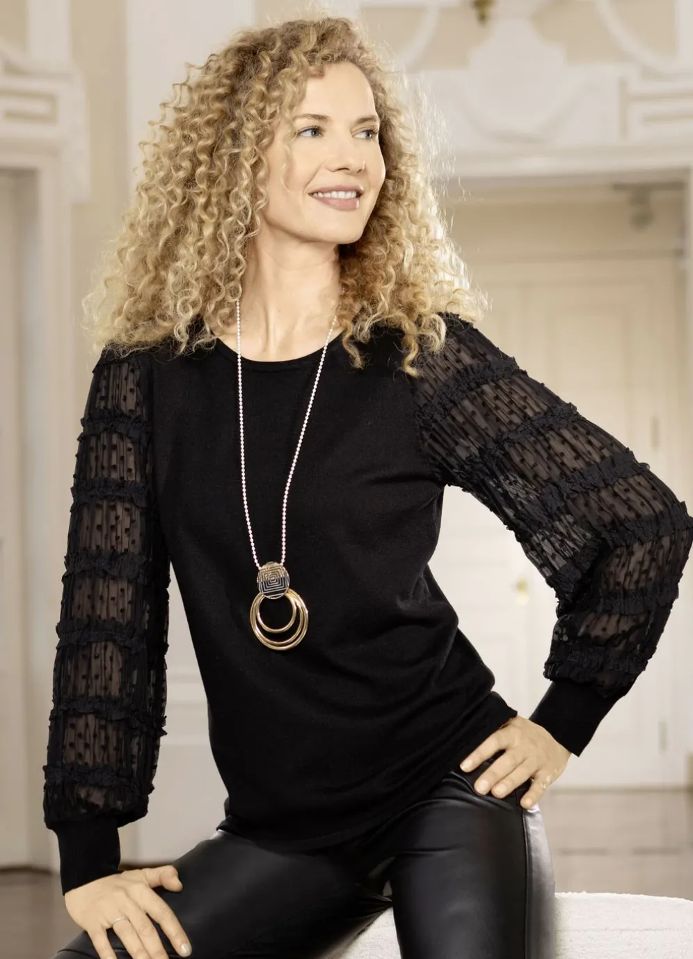 Ein femininer Hingucker ist dieser schwarze Pullover mit rundem Halsausschnitt sowie langen, aufwendig gearbeiteten Ärmeln aus Chiffon mit Rippenbündchen.