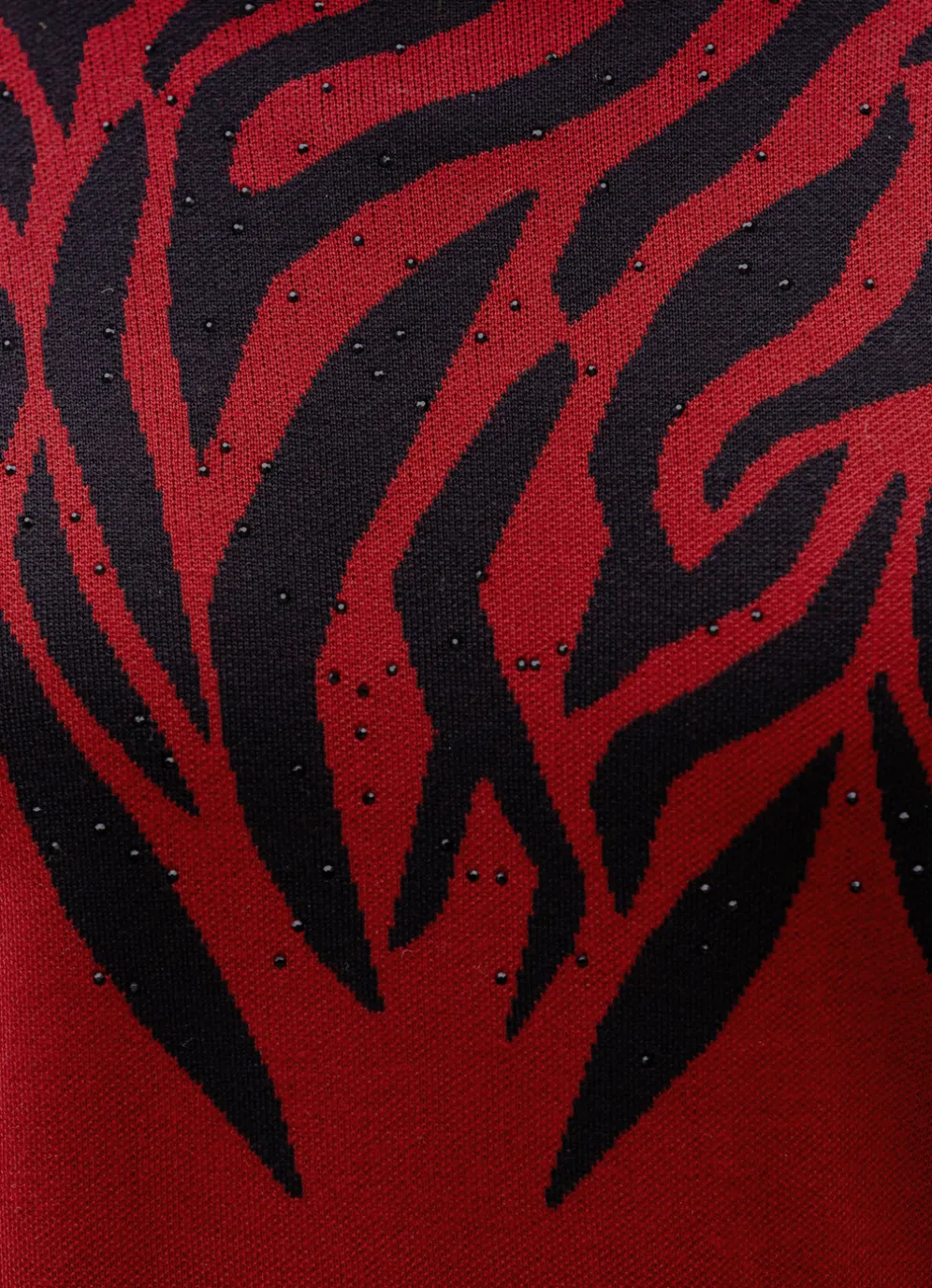 Extravaganter, rot-schwarzer Pullover in sehr weicher Qualität, mit rundem Halsausschnitt, streckendem, grafischem Muster mit schwarzer Strasszier im Vorderteil sowie langen Ärmeln.