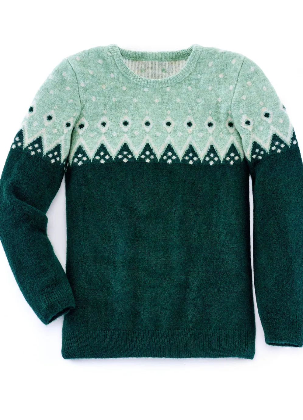 Toller Pullover: flauschiges Garn mit hübschen Melange-Effekten allover, außergewöhnliches Jacquardmuster im oberen Bereich rundum, runder Halsausschnitt sowie Rippenbund an den Abschlüssen der langen Ärmel und am Saum.