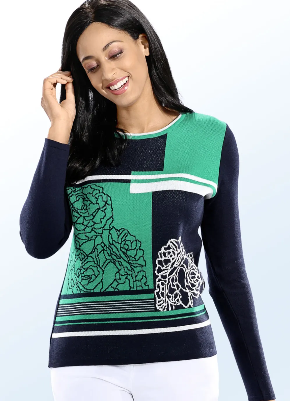 Geschmackvoller Pullover in Marine-Grün-Ecru: runder Halsausschnitt mit rolliertem Kontrastabschluss, Jacquard-Dessin im Vorderteil sowie lange Ärmel.