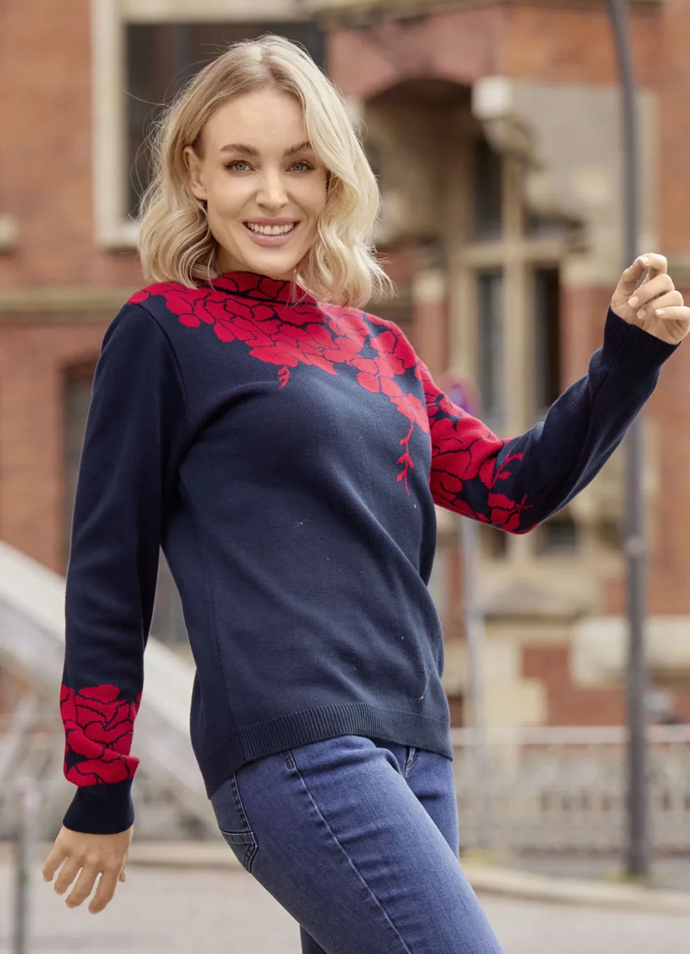 Pullover mit floralen Jacquardakzenten in Marine-Rot und in Größe 38.