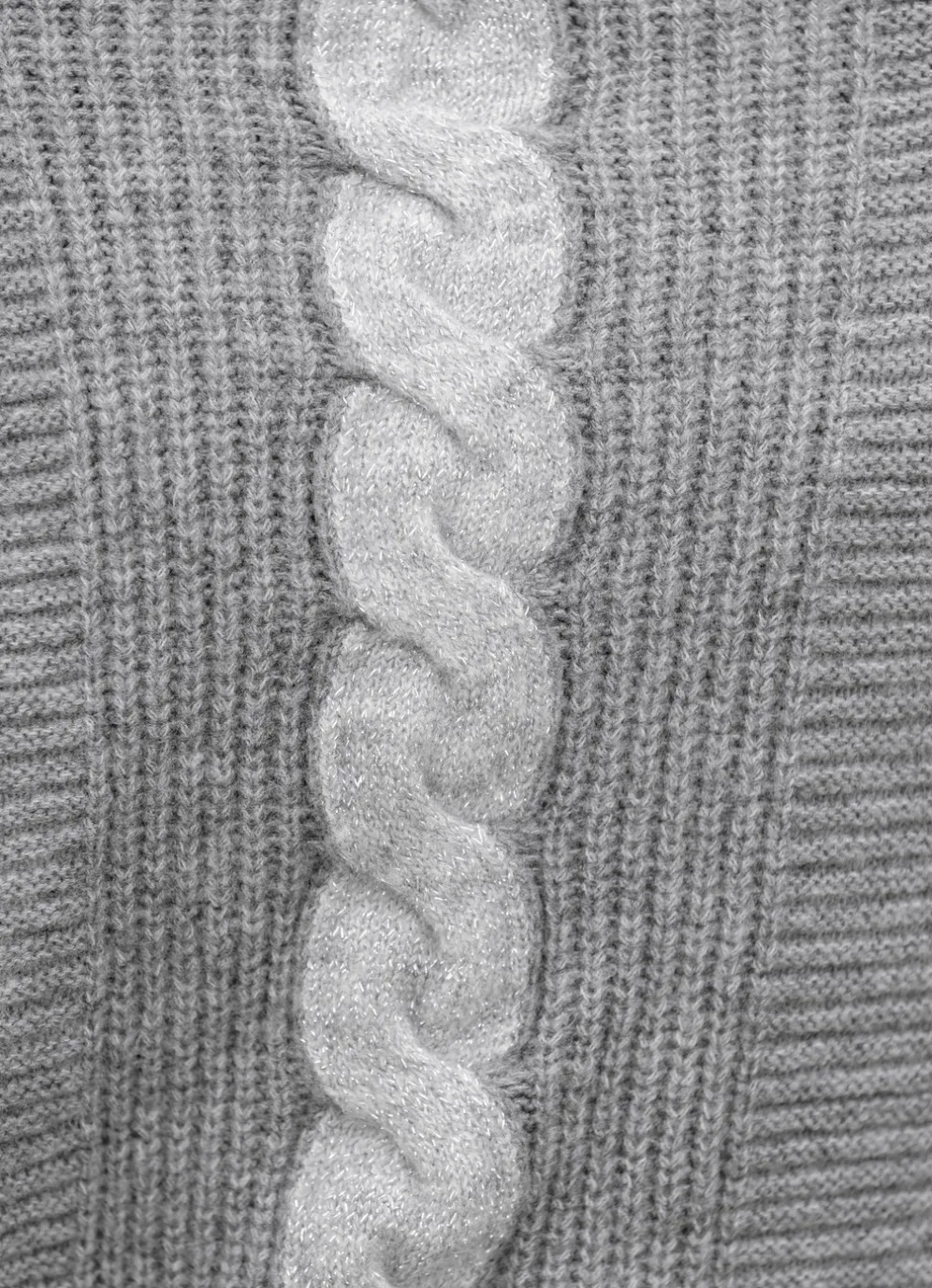Flotter Pullover in Grau meliert-Hellgrau meliert, mit weiterem Karree-Ausschnitt, Strukturmustermix vorne, streckendem Zopfmuster mit Glitzerakzenten im Vorderteil und an den langen Raglanärmeln sowie Rippenbundabschlüssen. Perlfangmuster im Rückteil.