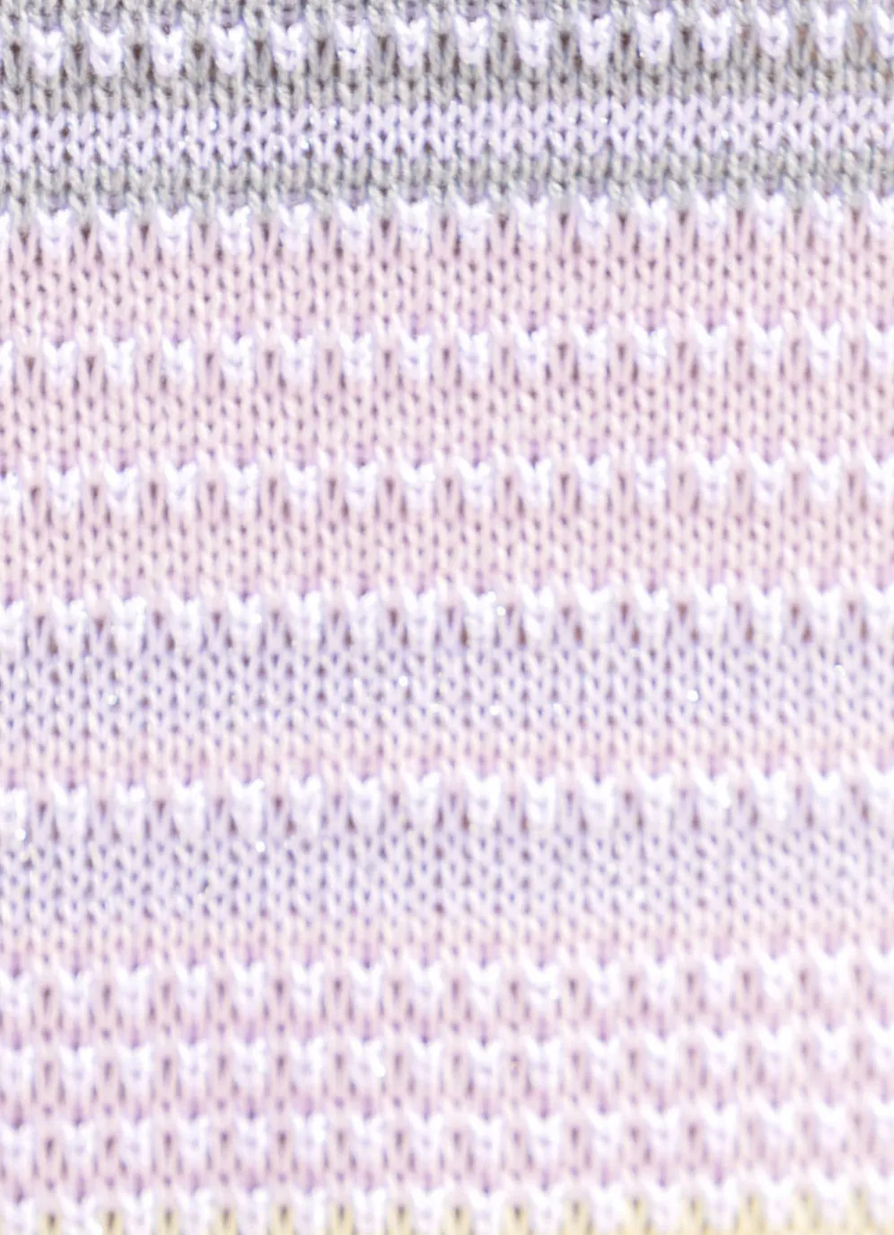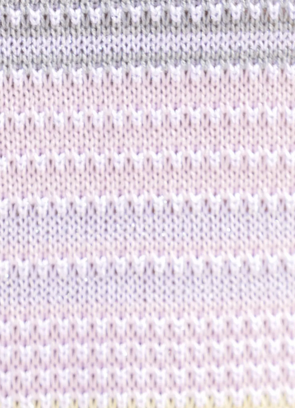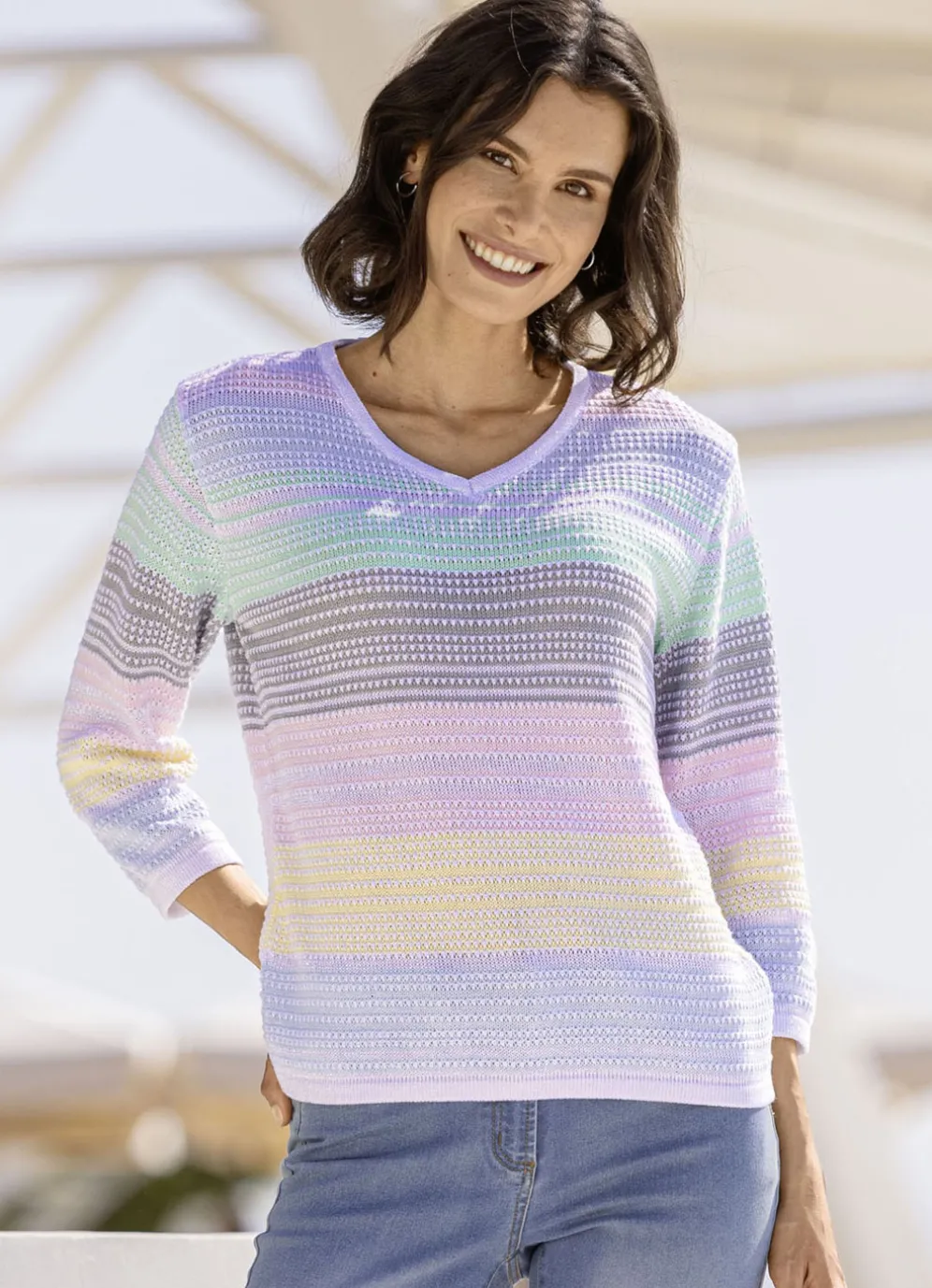 Pullover in Weiß-Multicolor, mit Strukturmuster in edlem Streifendessin mit Glitzer-Akzenten allover, V-Ausschnitt, Ärmeln in modischer Länge sowie gerippten Abschlüssen.