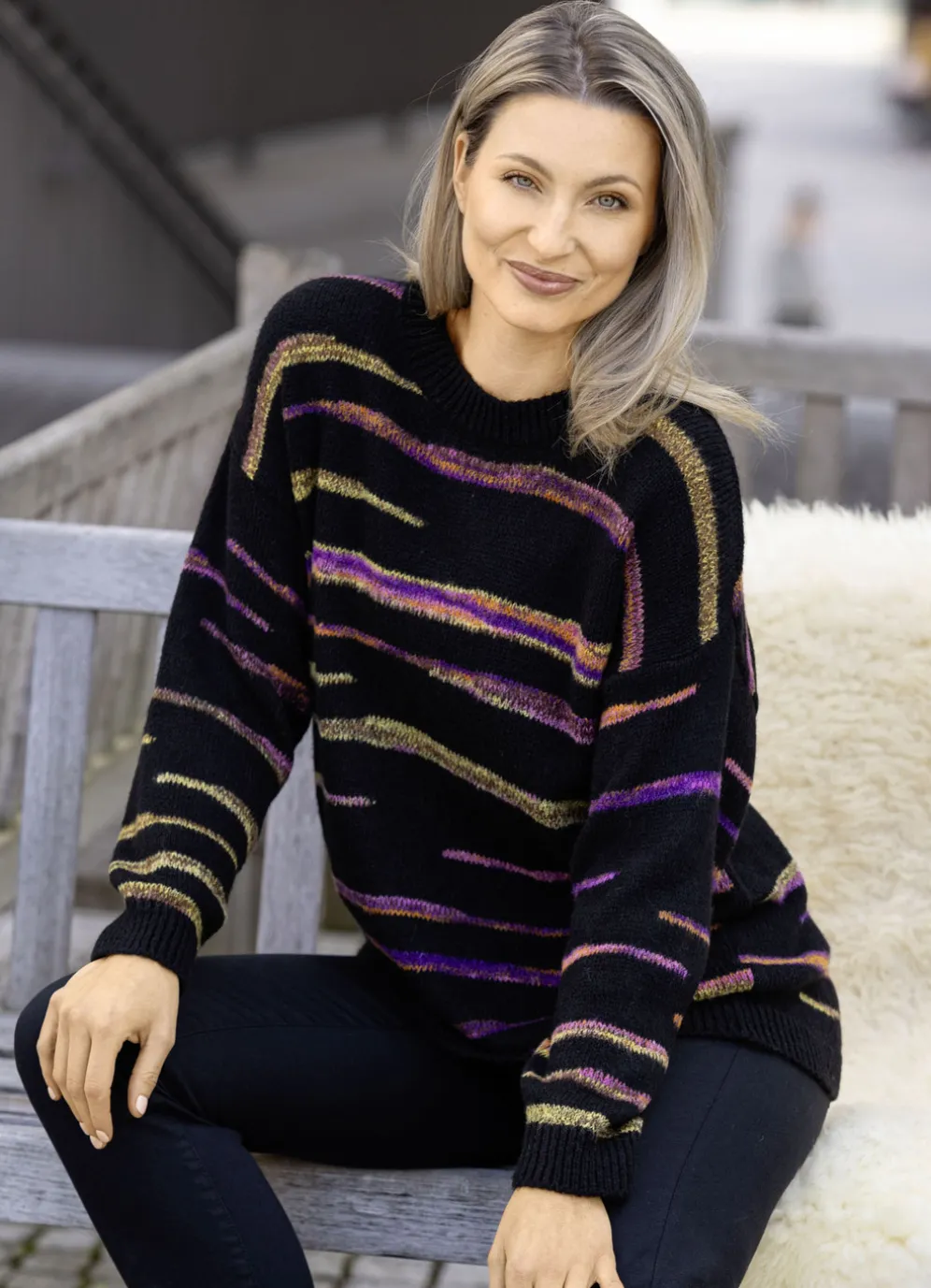 Pullover mit Intarsienstreifen in Größe M(40/42) und in Schwarz-Multicolor.