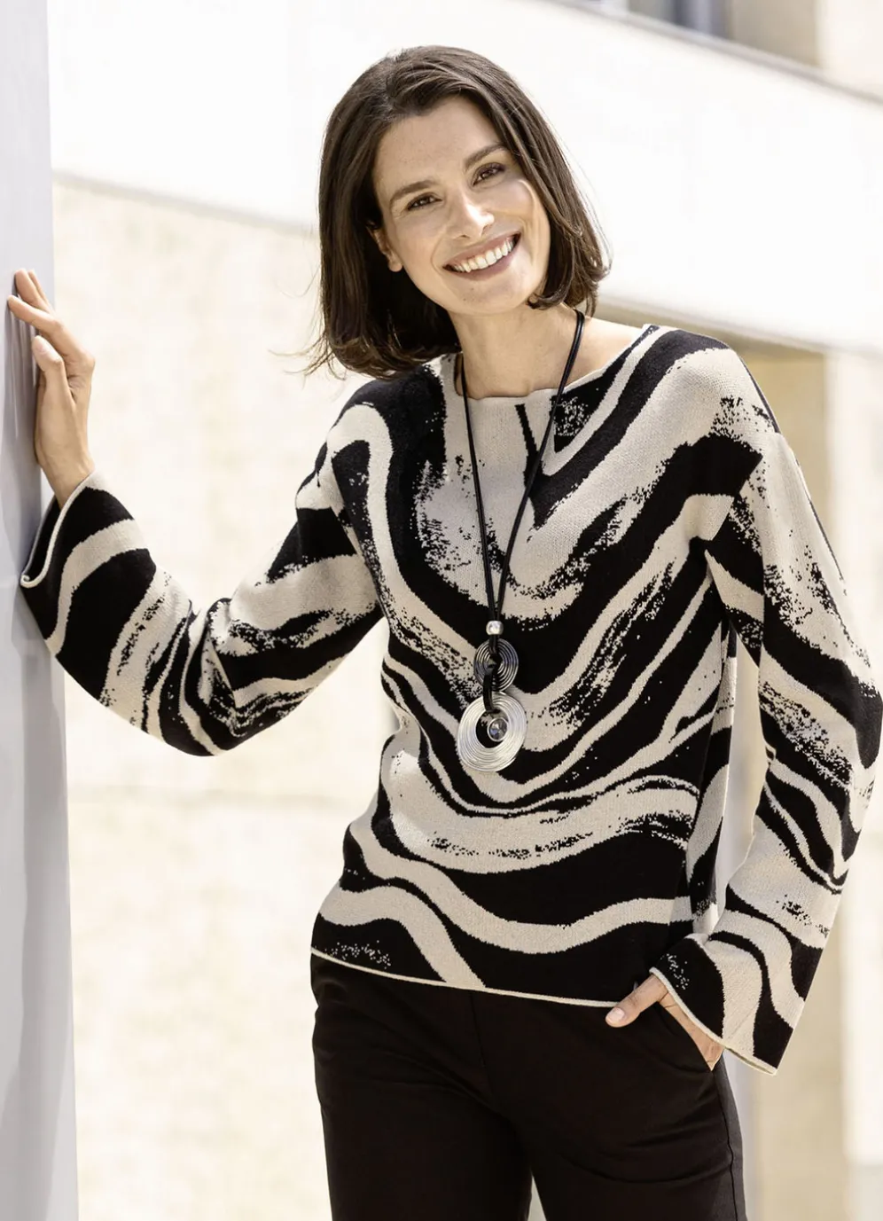 Jedes Teil ein Unikat! Ausdrucksstarker, weicher Pullover mit hübschem Allover-Jacquard-Dessin in Schwarz-Beige, flachem Halsausschnitt, überschnittener Schulter sowie weiten, langen Ärmeln.
