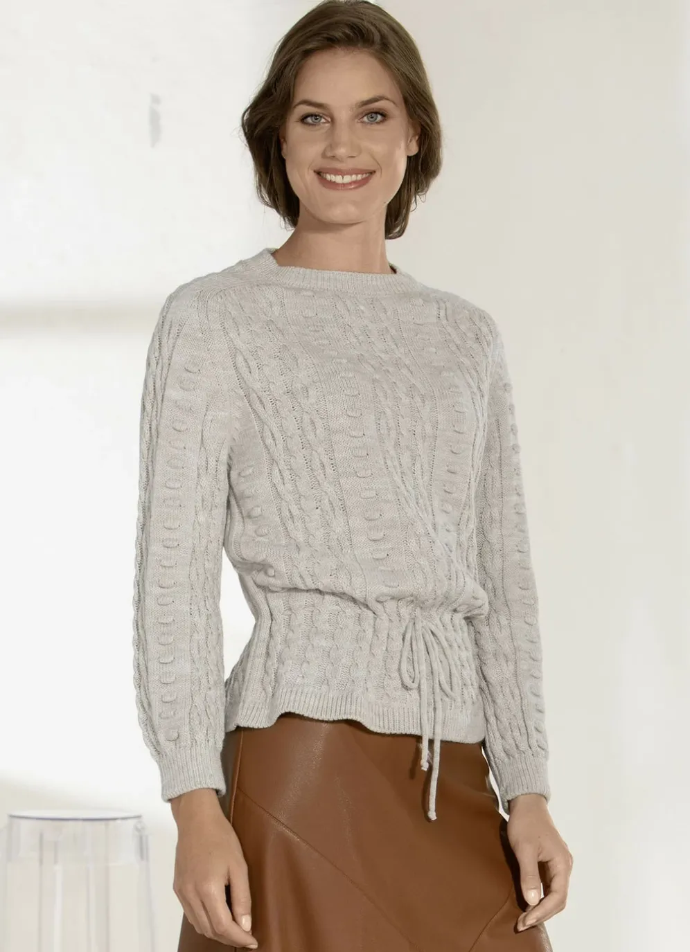 Wunderschöner Pullover in Sandbeige: Strukturmustermix mit Zopfelementen und Melange-Effekten allover, runder Halsausschnitt, Rippenbündchen an den Abschlüssen der langen Ärmel sowie Kordelzug in der Taille.
