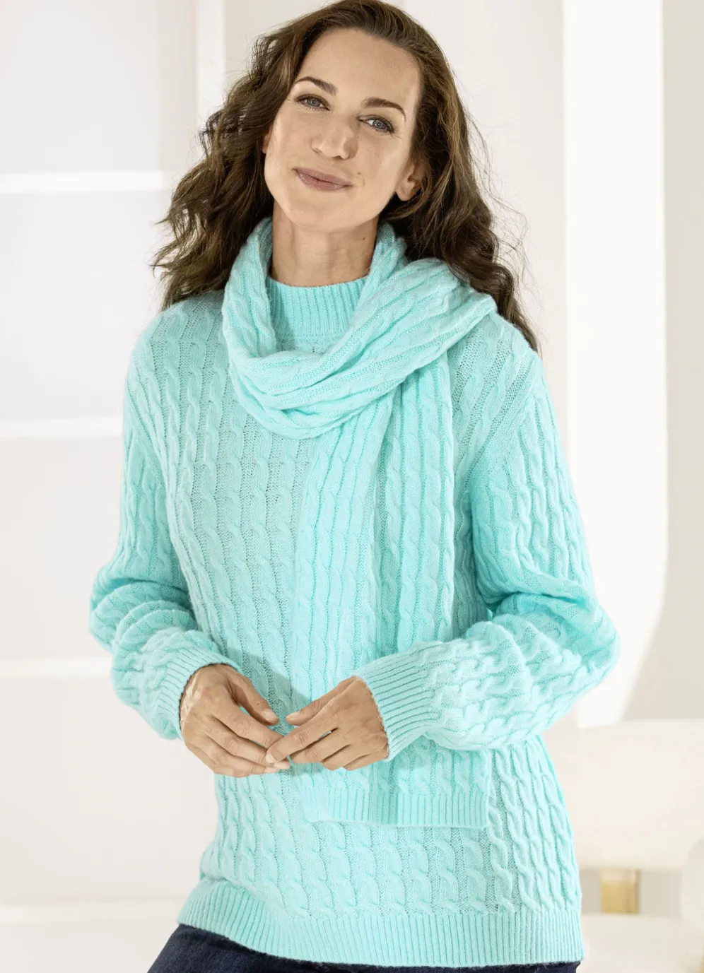 Ein Set zum Träumen! Kuschelweicher Pullover mit Schal mit Zöpfchenmuster allover, Stehbund, überschnittener Schulterpartie, langen Ärmeln und Rippenabschlüssen.