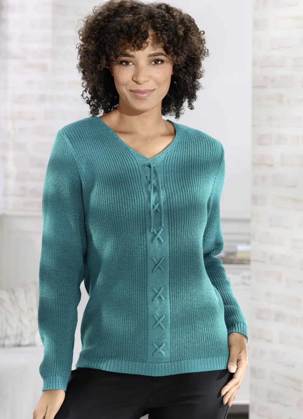 Hochwertiger Pullover in Petrol mit viel Raffinesse, V-Ausschnitt und gerippten Abschlüssen an den langen Ärmeln und am Saum. Der Feinstrickstreifen mit Strickbanddurchzug als Schnürung lässt im Vorderteil einen interessanten Strickmix entstehen.