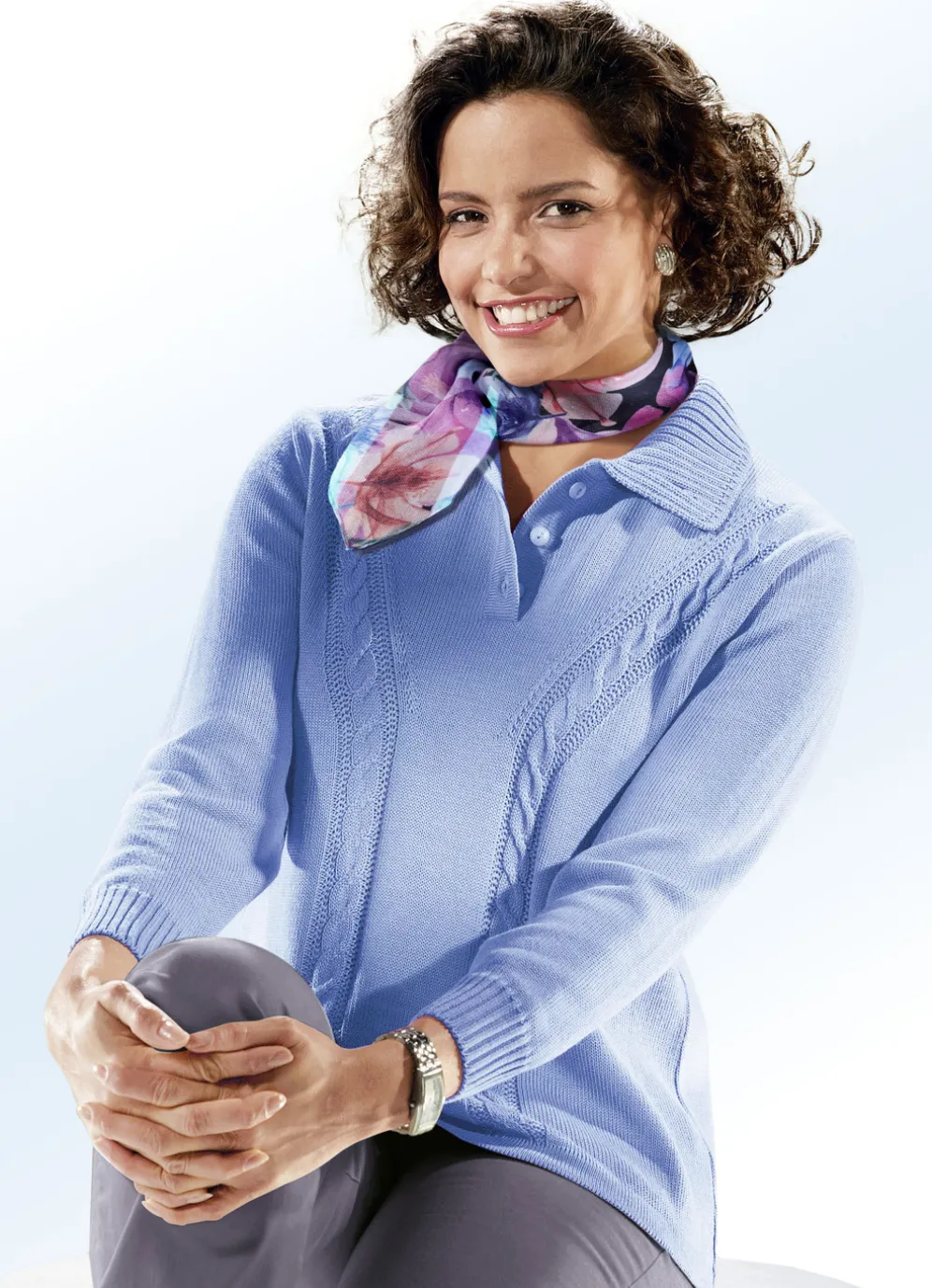 Wunderschöner Pullover mit Kragen, kurzer Knopfleiste sowie dekorativem Zopfstreifen-Dessin im Vorderteil.