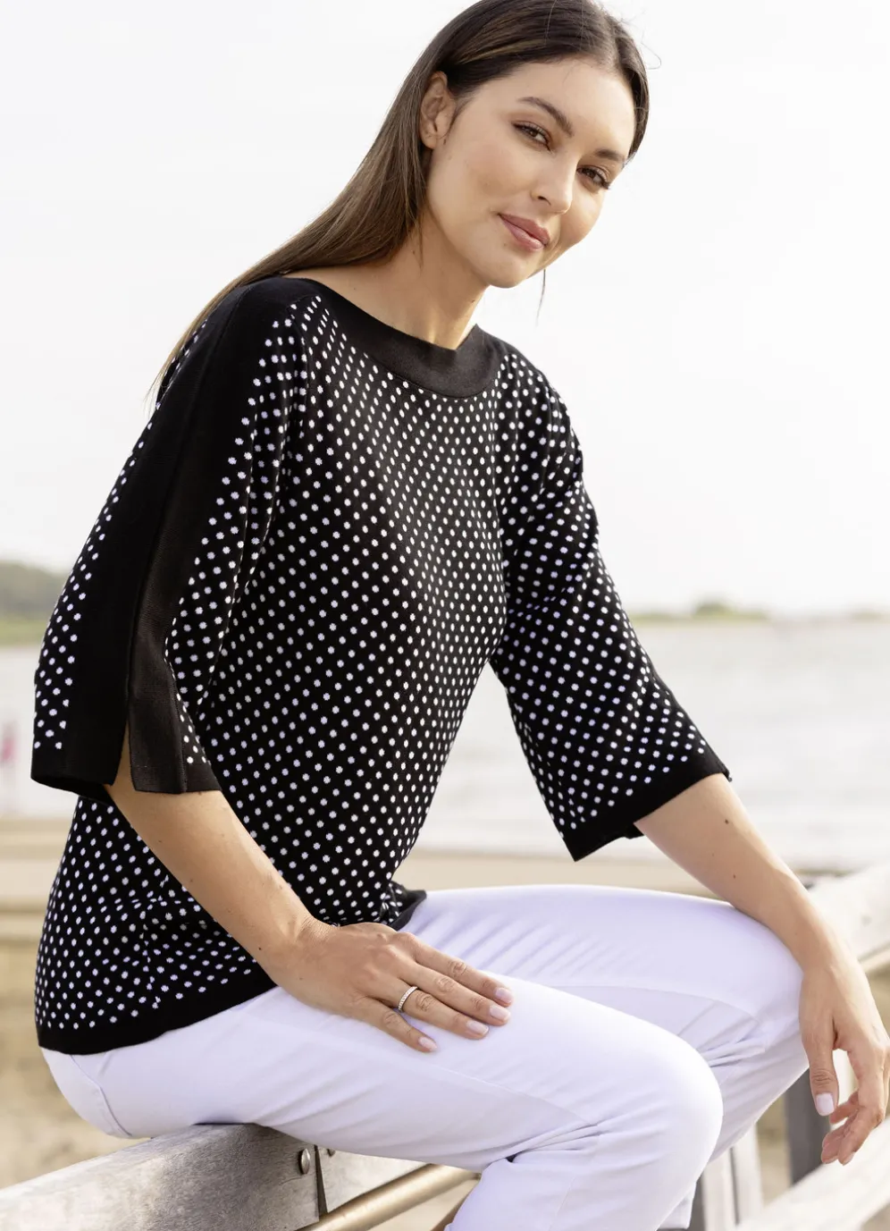 Mit diesem modischen Highlight können Sie punkten: pfiffiger, schwarz-weißer Pullover mit sehr weichem Griff, Punktedessin allover, U-Boot-Ausschnitt sowie etwas weiteren, 3/4-langen Ärmeln mit Schlitz.
