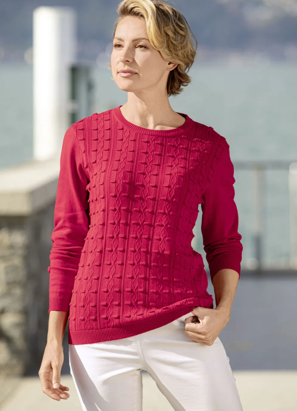 Ansprechender Pullover mit streckendem Strukturmuster im Vorderteil, rundem Halsausschnitt sowie Rippenbund an den langen Ärmeln und am Saum.