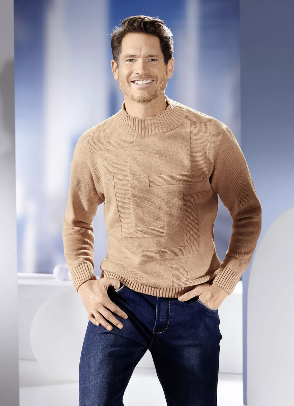 Das Besondere an diesem schicken, unifarbenen Pullover ist das attraktive Strukturdessin allover. Mit Stehkragen und Rippenstrick-Abschlüssen.