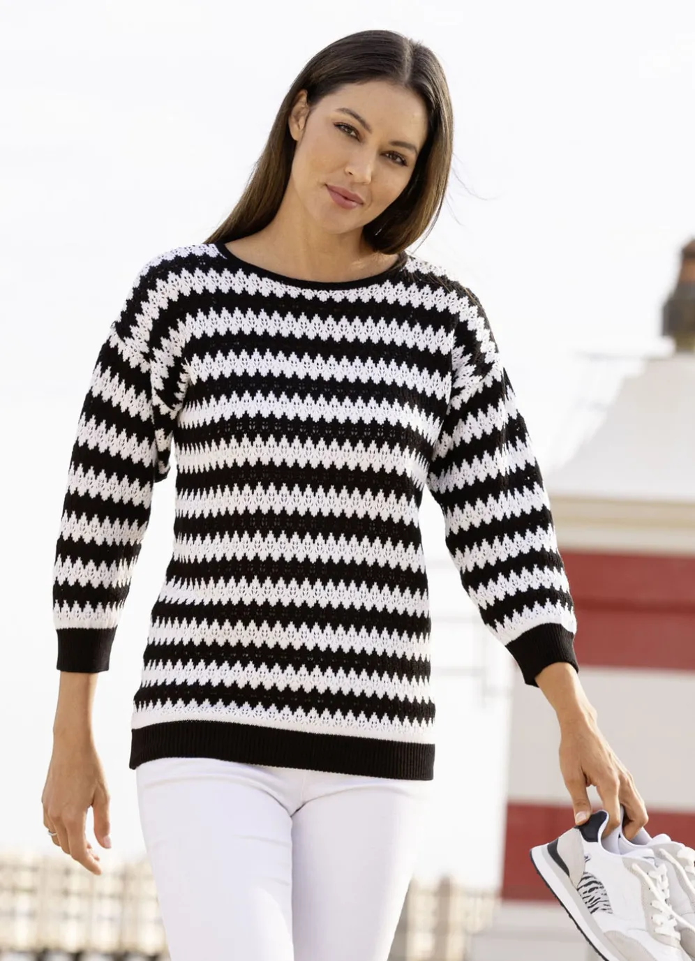 Umwerfender, schwarz-ecrufarbener Pullover mit angesagtem Struktur- und Ajourmuster in Streifen- und Zackendessin allover, rundem Halsausschnitt, überschnittener Schulterpartie sowie Rippenbund an den Ärmeln in modischer Länge und am Saum.