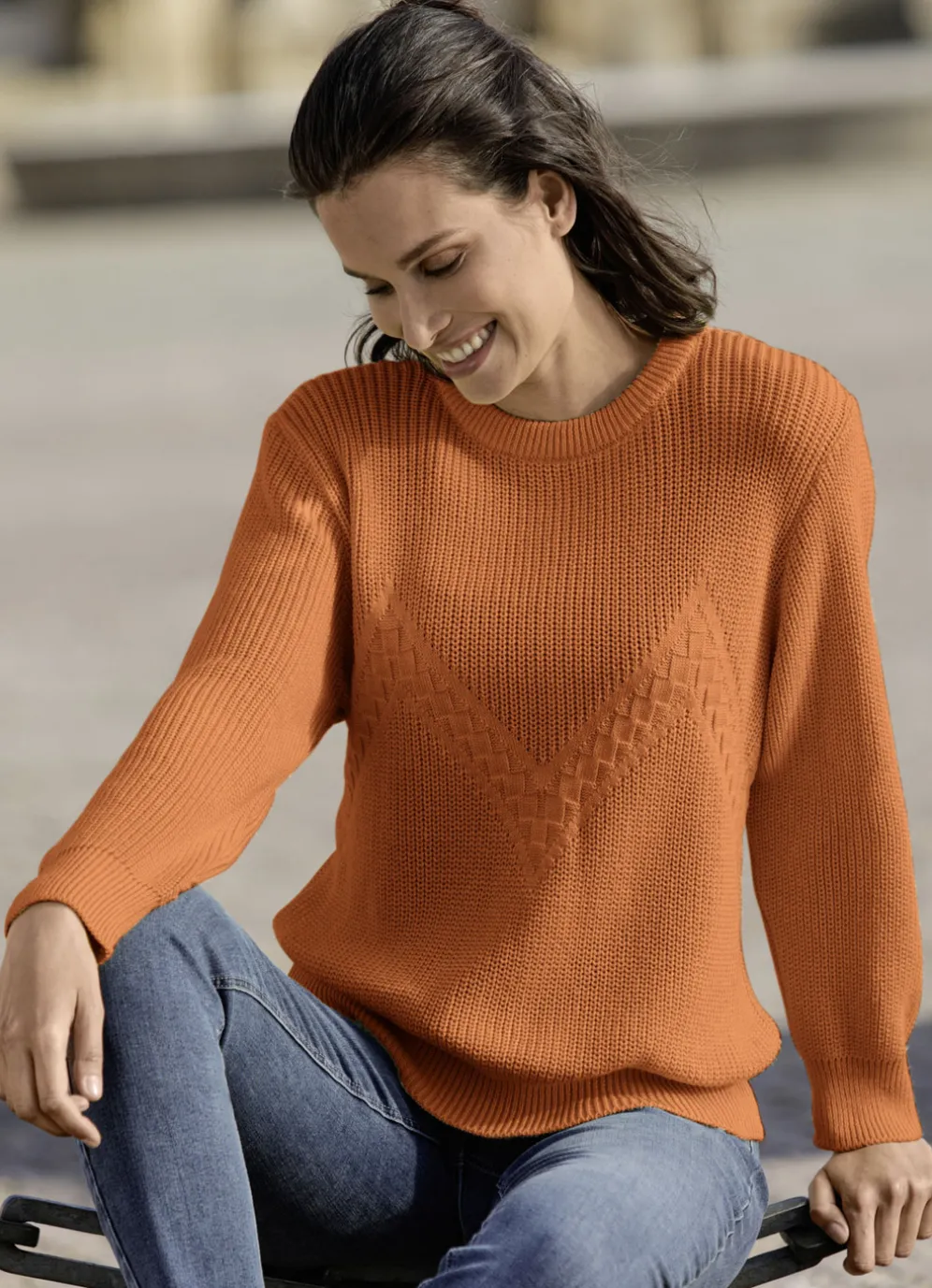 Sehr kuschelig und attraktiv zugleich ist dieser hübsche Pullover mit Bündchenabschlüssen, rundem Halsausschnitt, Vorder- und Rückteil in streckender Optik durch Rundumstruktur mit Zackendessin sowie langen Ärmeln.
