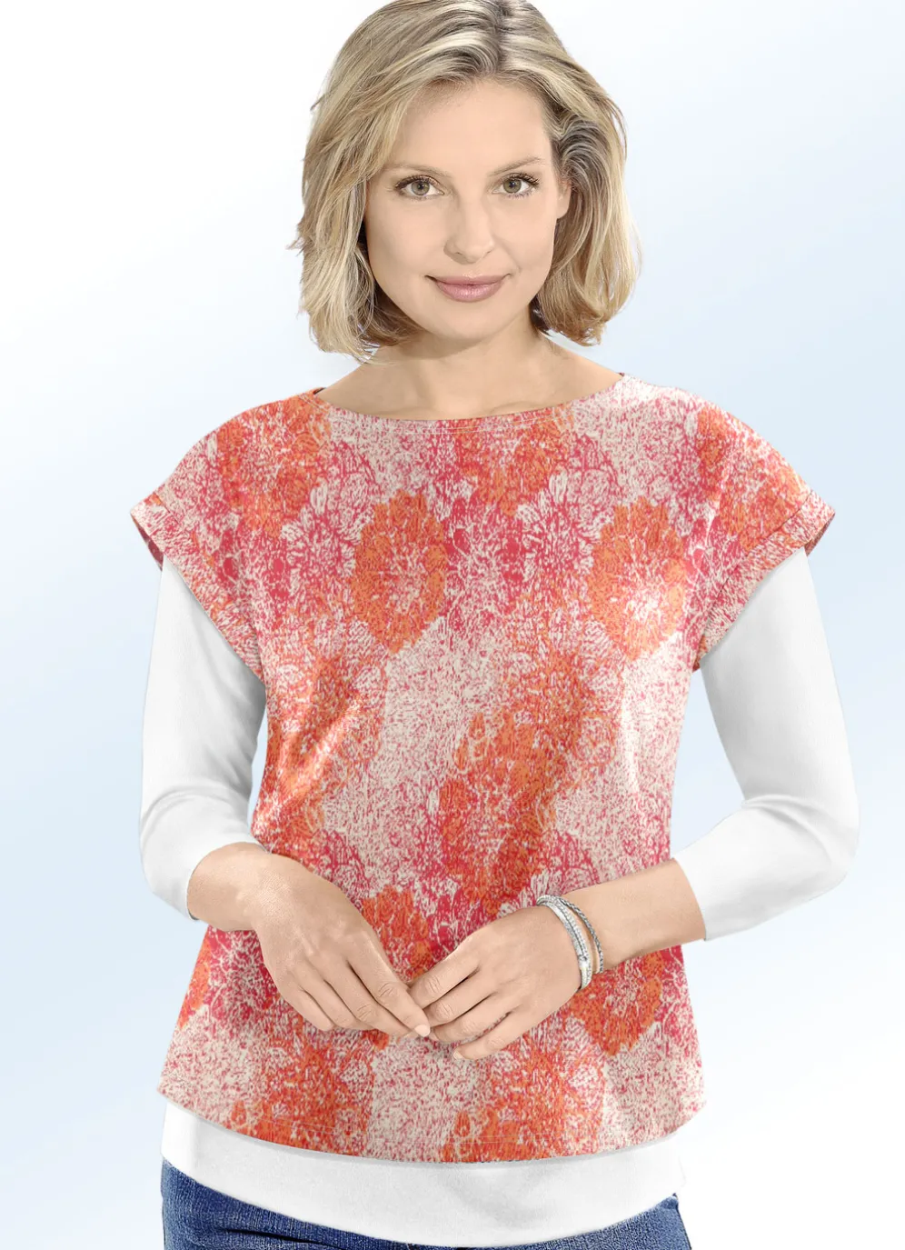 kurzen Ärmeln sowie leicht abgerundetem Saum im Vorder- und Rückteil.
