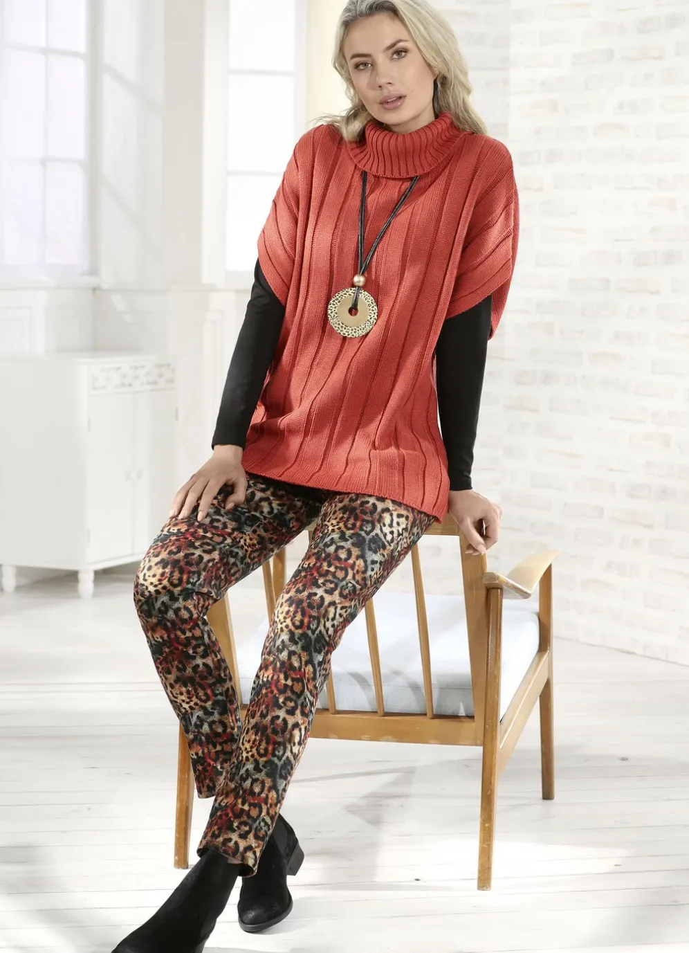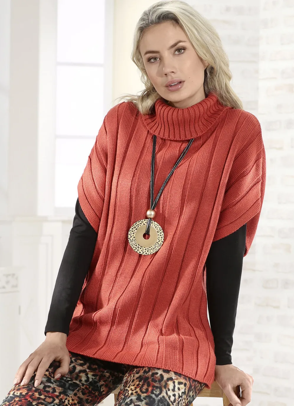 Besonderer, terrafarbener Pullunder mit Rollkragen, weit überschnittener Schulterpartie sowie Strukturstreifen in streckender Optik im Vorderteil.