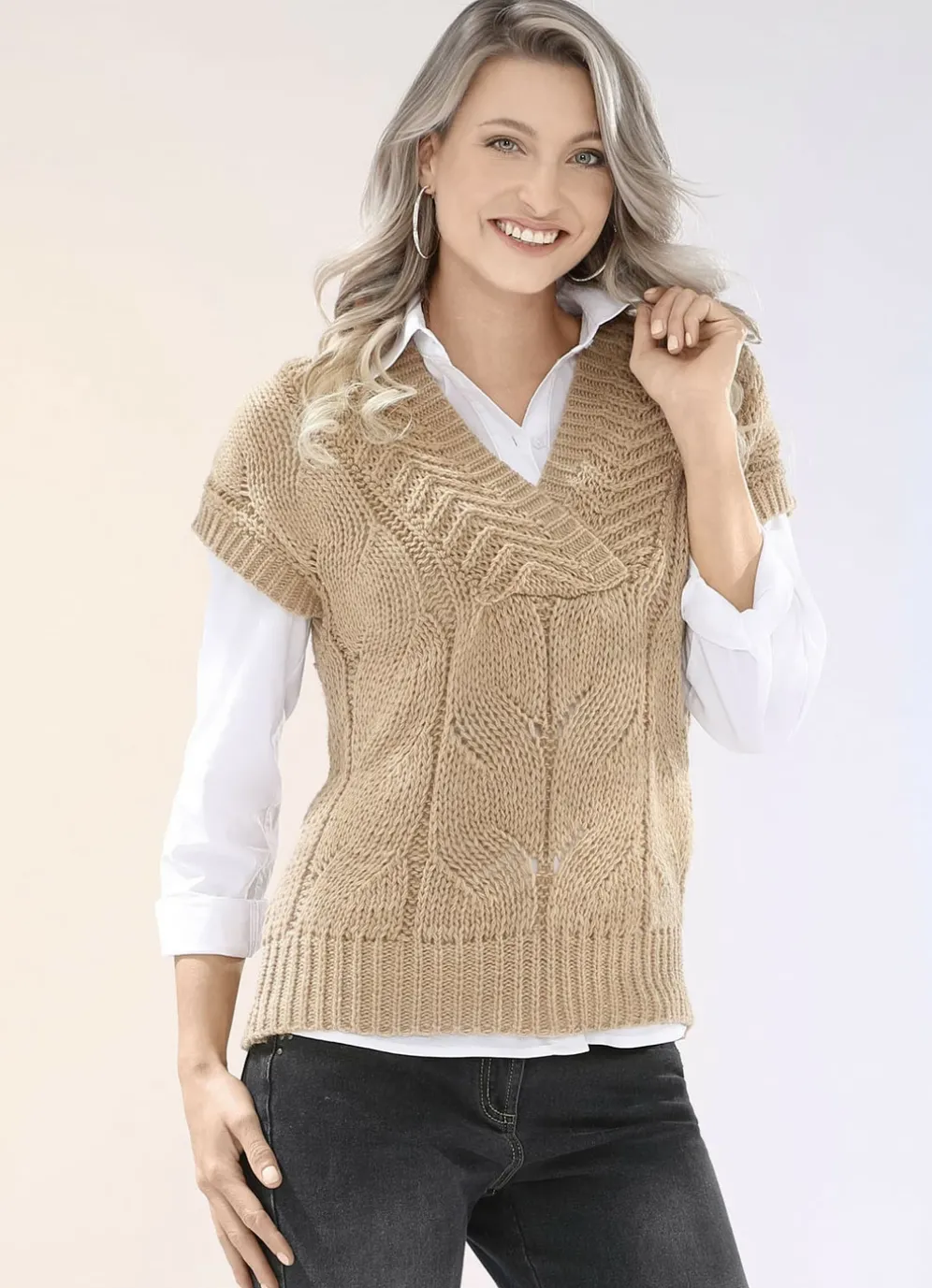 Pullunder: überkreuzter streckender V-Ausschnitt mit Zackenstruktur, Wellendessin in Zopfoptik mit Ajourakzenten im Vorderteil, gerippte Abschlüsse sowie Rückteil in Perlfang.