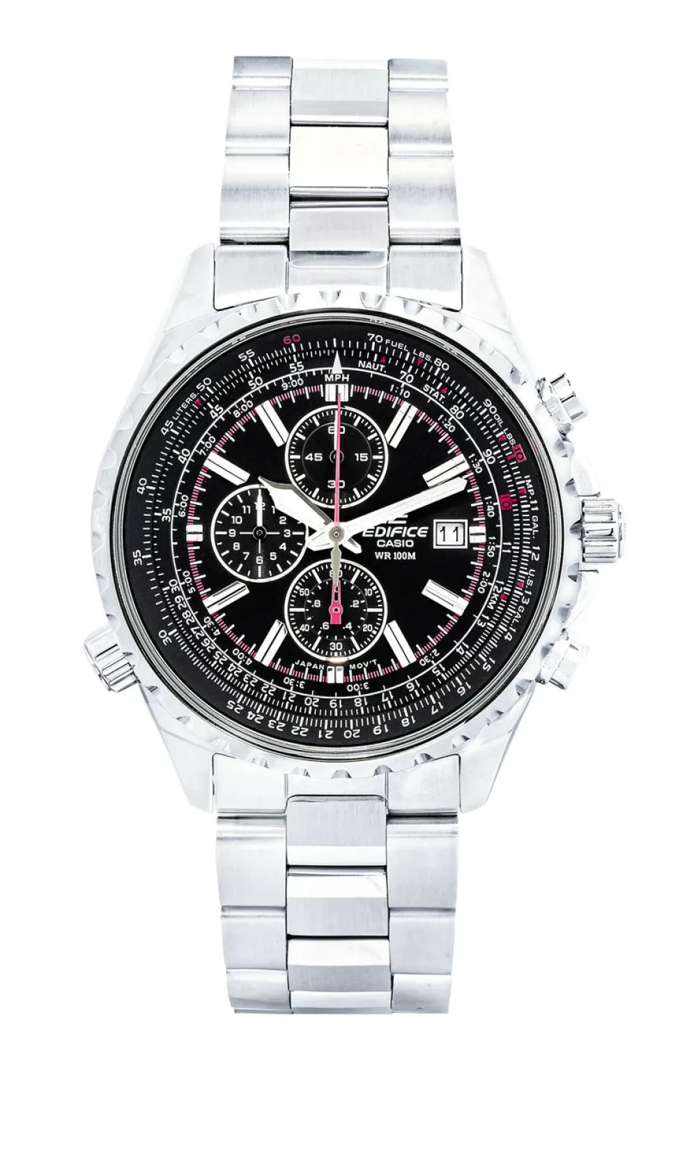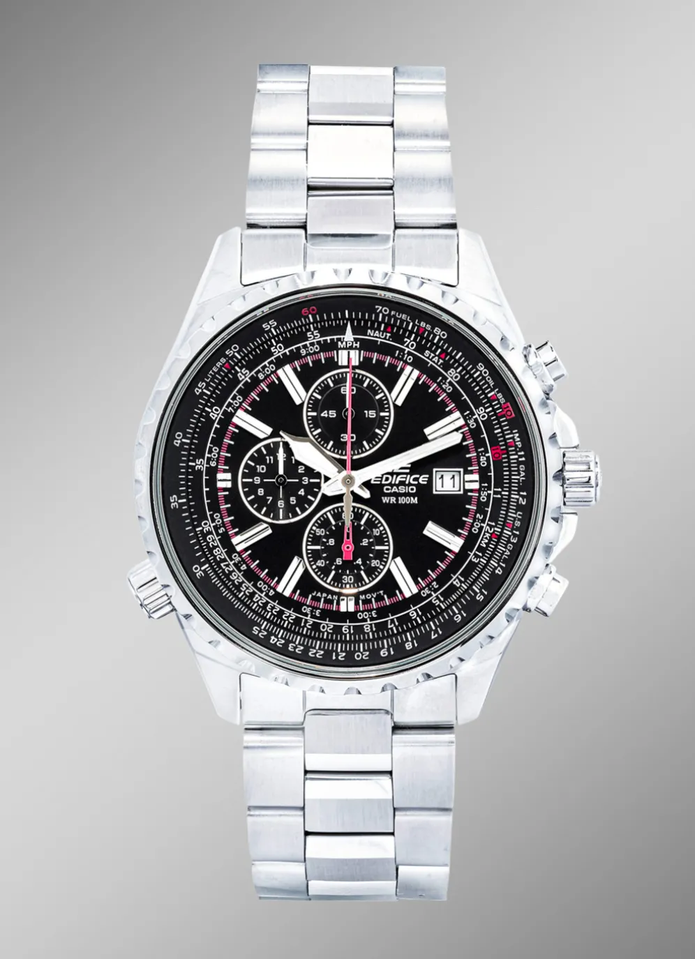 Dieser Quartz-Herrenuhr-Chronograph ist ausgestattet mit einem Edelstahlbandgehäuse mit Sicherheitsschließe und Mineralglas. Mit seinen Funktionen eignet sich diese Herrenuhr auch sehr gut zum Tauchen. Die Uhr bietet eine Datums-Anzeige, einen Stoppuhr, eine Rechenschieber-Funktion, einen verschraubten Gehäuseboden und eine verschraubte Krone.