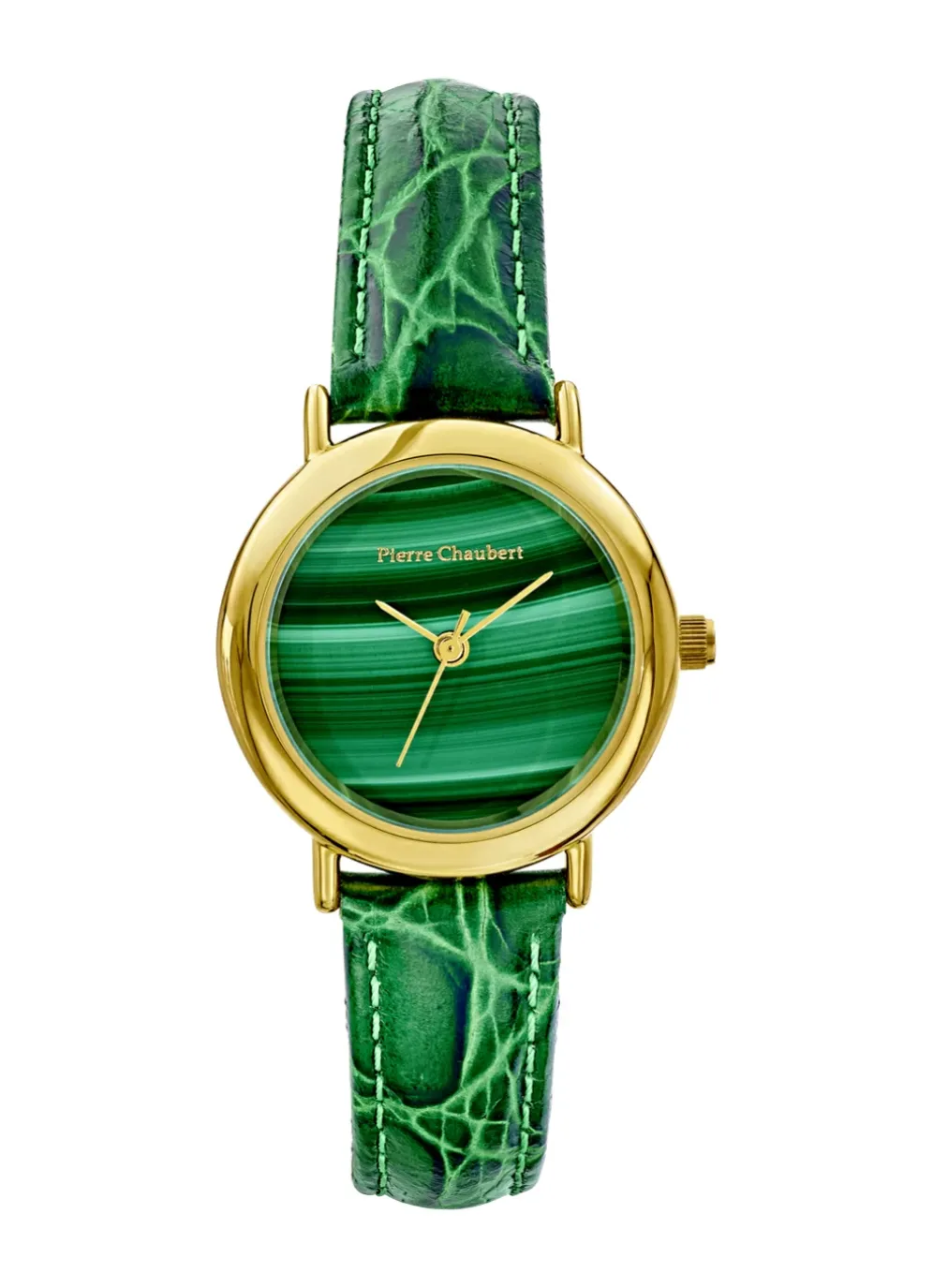 Jede Uhr ein Unikat: Wunderschöne Quartz-Damenuhr der Marke „Pierre Chaubert“. Die Damenuhr hat ein Metallgehäuse, ein Zifferblatt mit echter Malachit-Einlage und ein farblich passendes Lederband.