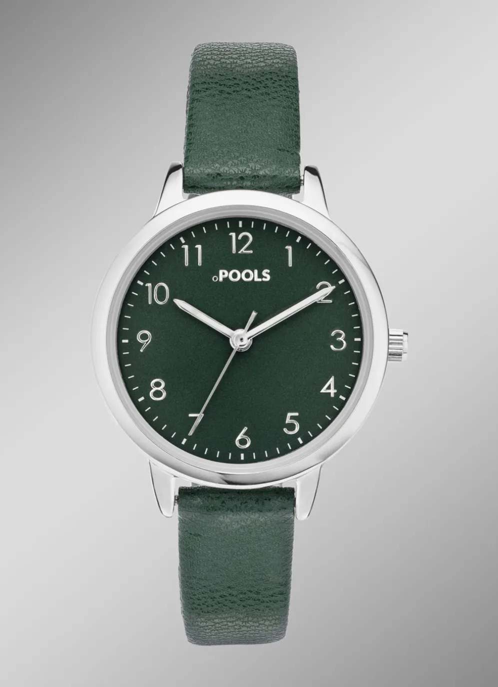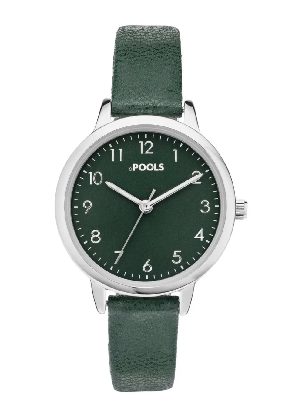 Unsere neue Damenuhr ist das perfekte Accessoire für jeden Anlass. Mit ihrem robusten silberfarbenen Metallgehäuse und dem eleganten dunkelgrünen Kunstlederband mit Dornschliesse ist sie sowohl langlebig als auch stilvoll. Das Minerlaglas schützt das farblich abgestimmte Zifferblatt vor Kratzern und Beschädigungen. Die Anzeige von Stunde, Minute und Sekunde sorgt dafür, dass Sie immer pünktlich sind.