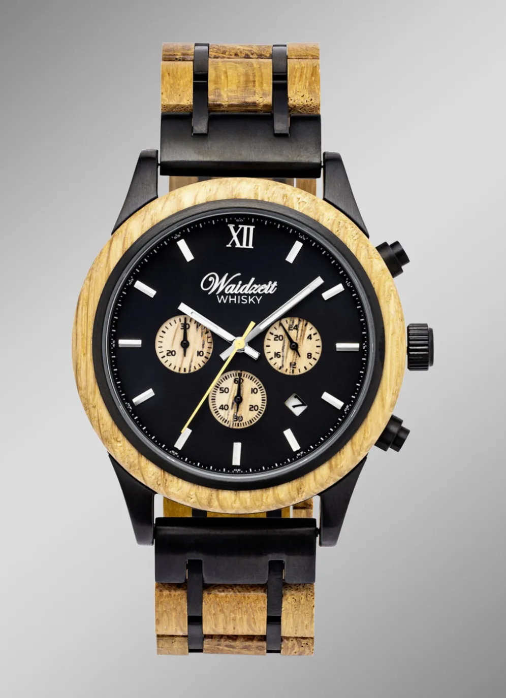 Unser Whisky Chronograph Scotts Highland erinnert mit seiner erdigen Farbgebung an die Moore der schottischen Hochlands. Der occerfarberne Sekundenzeiger ist dem Farbton des Whiskys nachempfunden. Der Waidzeit Chronograph besticht durch zahlreiche Raffinessen wie Stoppfunktion, kleine Sekunde und Datumsanzeige. Zudem wurde das Holz, das zur Herstellung der Uhr verwendet wird, aus recycelten Whiskyfässern gefertigt. Ursprünglich wurde das Whiskyfass für die Lagerung weltbekannter Whiskysorten verwendet – ein Designprodukt mit Geschichte! Nun erfährt es ganz neue Verwendung – die aufwendige Verarbeitung zu individuellen Armbanduhren aus Eichenfass. Jede Whiskyuhr ist ein Unikat und hat eine spezielle Maserung und Struktur.