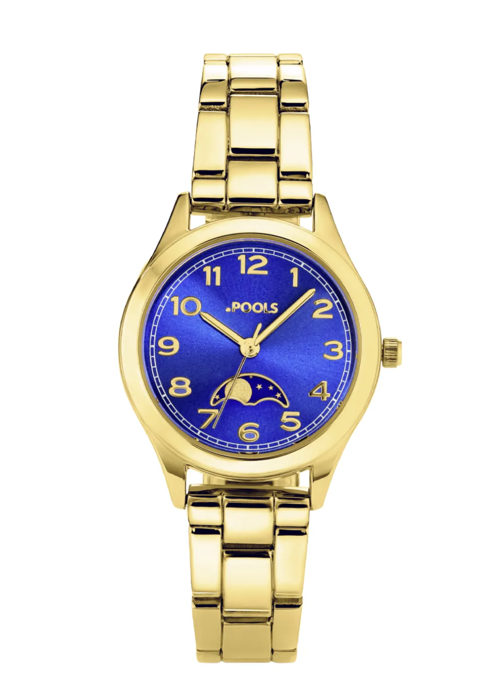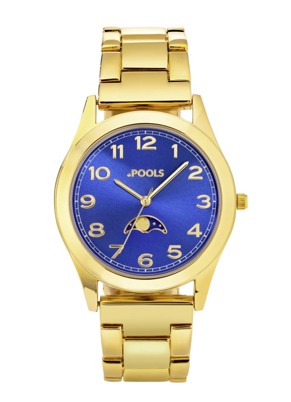 Pools 3341. Sie suchen eine elegante und zuverlässige Herrenuhr? Dann ist die Quartz-Mondphasenuhr genau das Richtige für Sie. Diese Uhr besticht durch ihr goldfarbenes Metallbandgehäuse mit Clipverschluss, das einen Hauch von Luxus verleiht. Das Mineralglas schützt das blaue Zifferblatt vor Kratzern und Stößen. Die Uhr ist außerdem spritzwassergeschützt, sodass Sie sie bei jedem Wetter tragen können.
