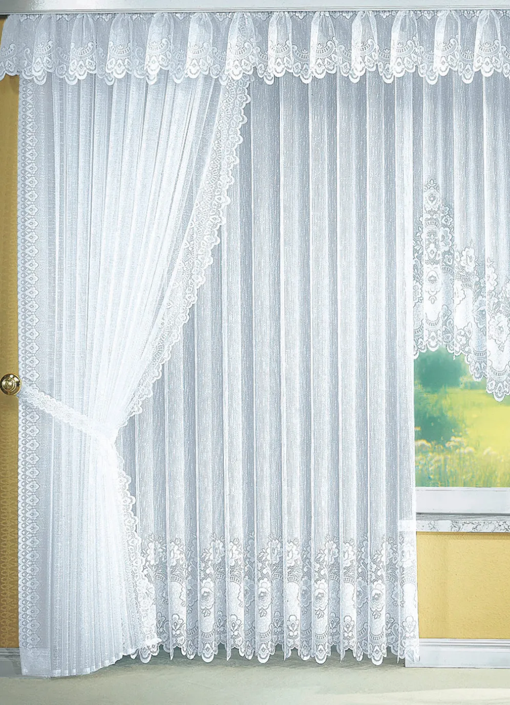 Weißer, dessinierter Querbehang mit leicht gebogtem Abschluss. Mit Faltenband. Bestellen Sie deshalb die 3-fache Leisten/Deko-Breite. 100% Polyester/„Trevira“. Nach Ökotex-Standard 100