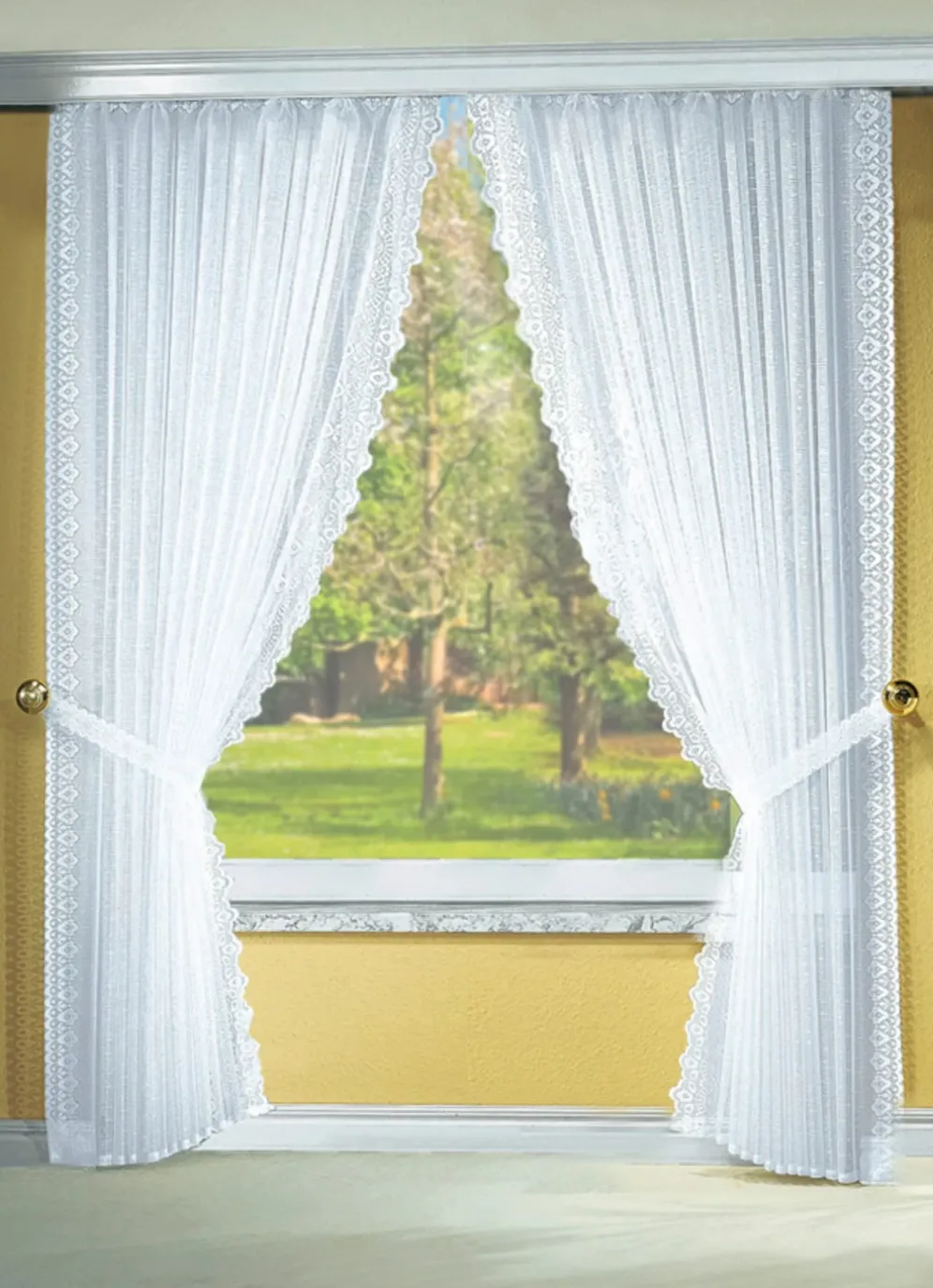 Weiße, dessinierte Raffgardinen-Garnitur. Mit Faltenband. Bestellen Sie deshalb die 3-fache Leisten/Deko-Breite. Zwei Schals und zwei Raffhalter in einer Packung. Maße pro Schal, Preise pro Garnitur. 100% Polyester/„Trevira“. Nach Ökotex-Standard 100