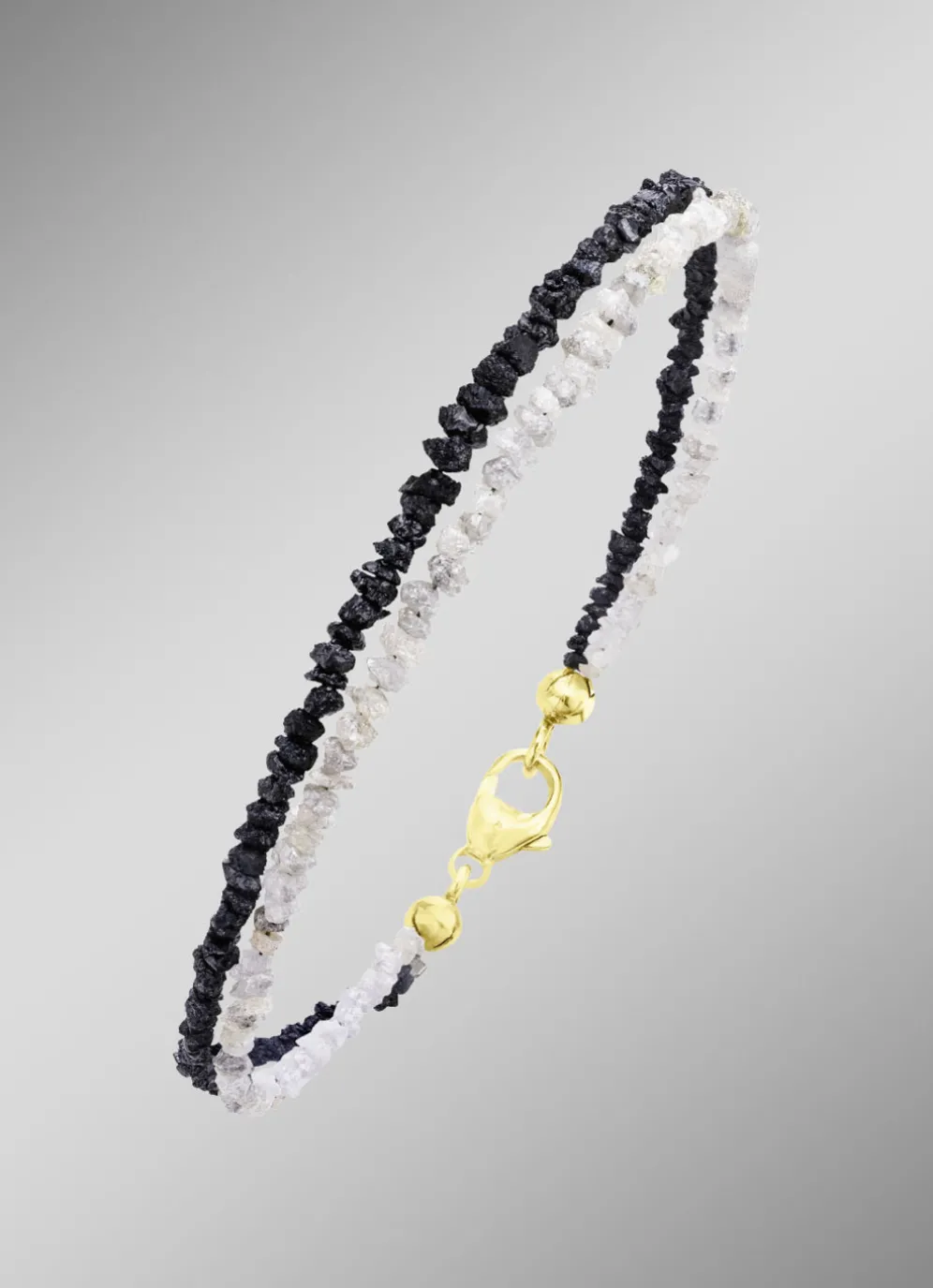Ein raffiniertes Schmuckstück mit natürlicher Eleganz: Dieses zweireihige Armband besticht durch Roh-Diamanten in Hell- und Dunkelgrau – zusammen ca. 15,00 ct. Die filigrane Breite von je ca. 3 mm sorgt für eine edle und zugleich markante Optik. Mit einer Länge von 20 cm schmiegt es sich perfekt ans Handgelenk. Der hochwertige Karabiner aus Silber 925/- fein, vergoldet, rundet das Design stilvoll ab – ein Ausdruck von Exklusivität und Individualität.