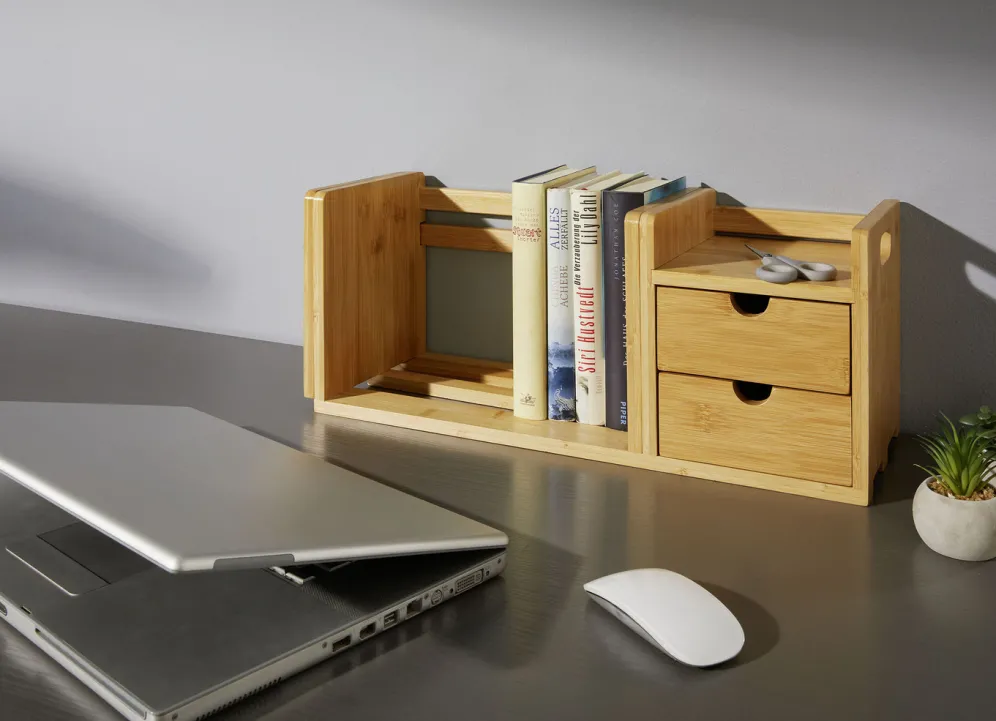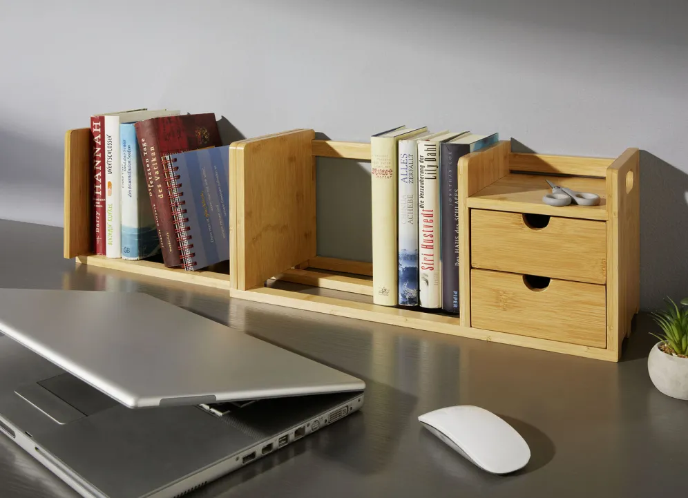 Regal für Arbeitszimmer, Bad oder Küche aus langlebigem und robustem Bambus. Ausziehbar auf bis zu 80 cm sowie mit 2 praktischen Schubladen gearbeitet. Die Lieferung erfolgt aufgebaut. Maße: B50–80xH21xT19 cm