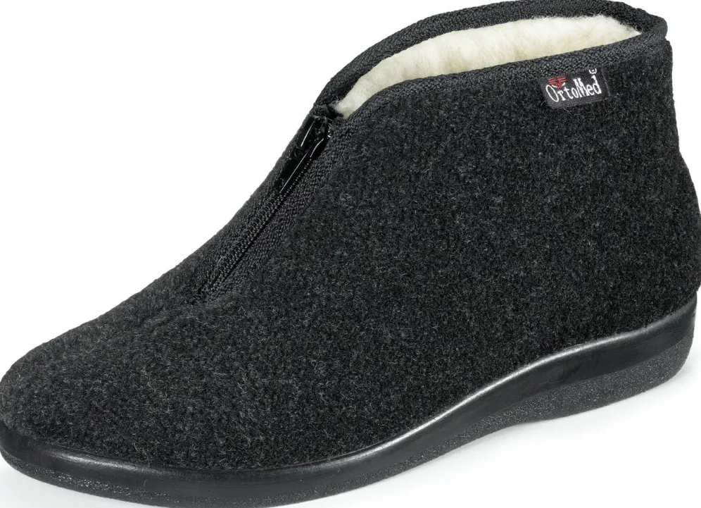 Schwarze Reißverschluss-Stiefelette aus weichem Textilmaterial: in Weite H, Warmfutter und Fußbettbezug aus reiner Wolle, superleichte PU-Laufsohle sowie 15 mm Keilabsatz