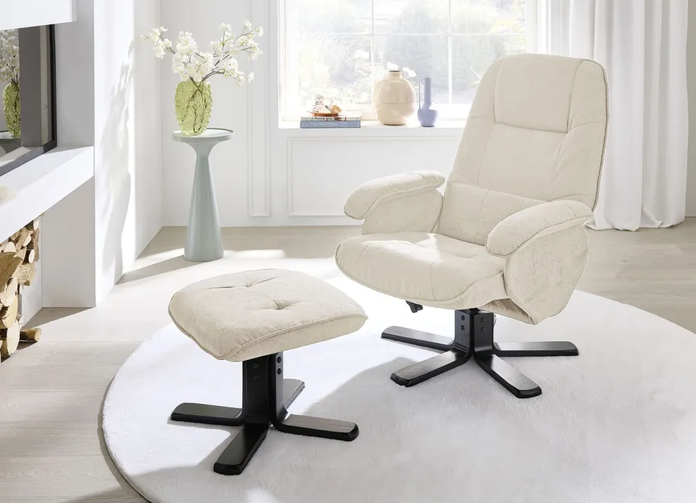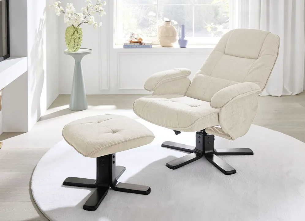 Relax-Sessel mit Hocker in Creme.