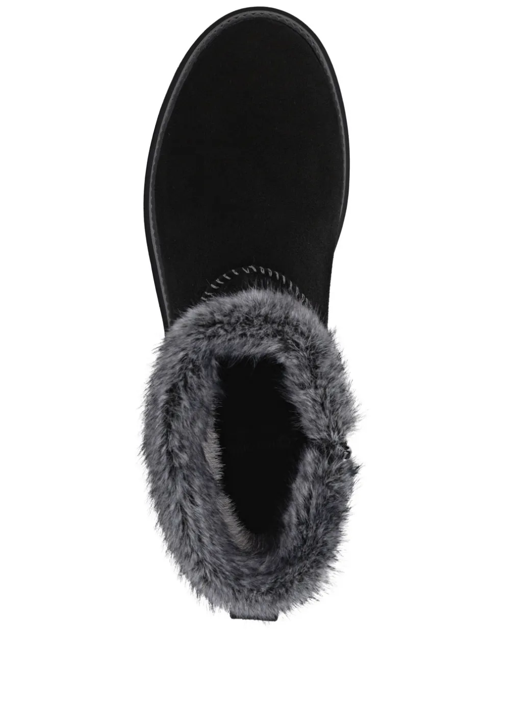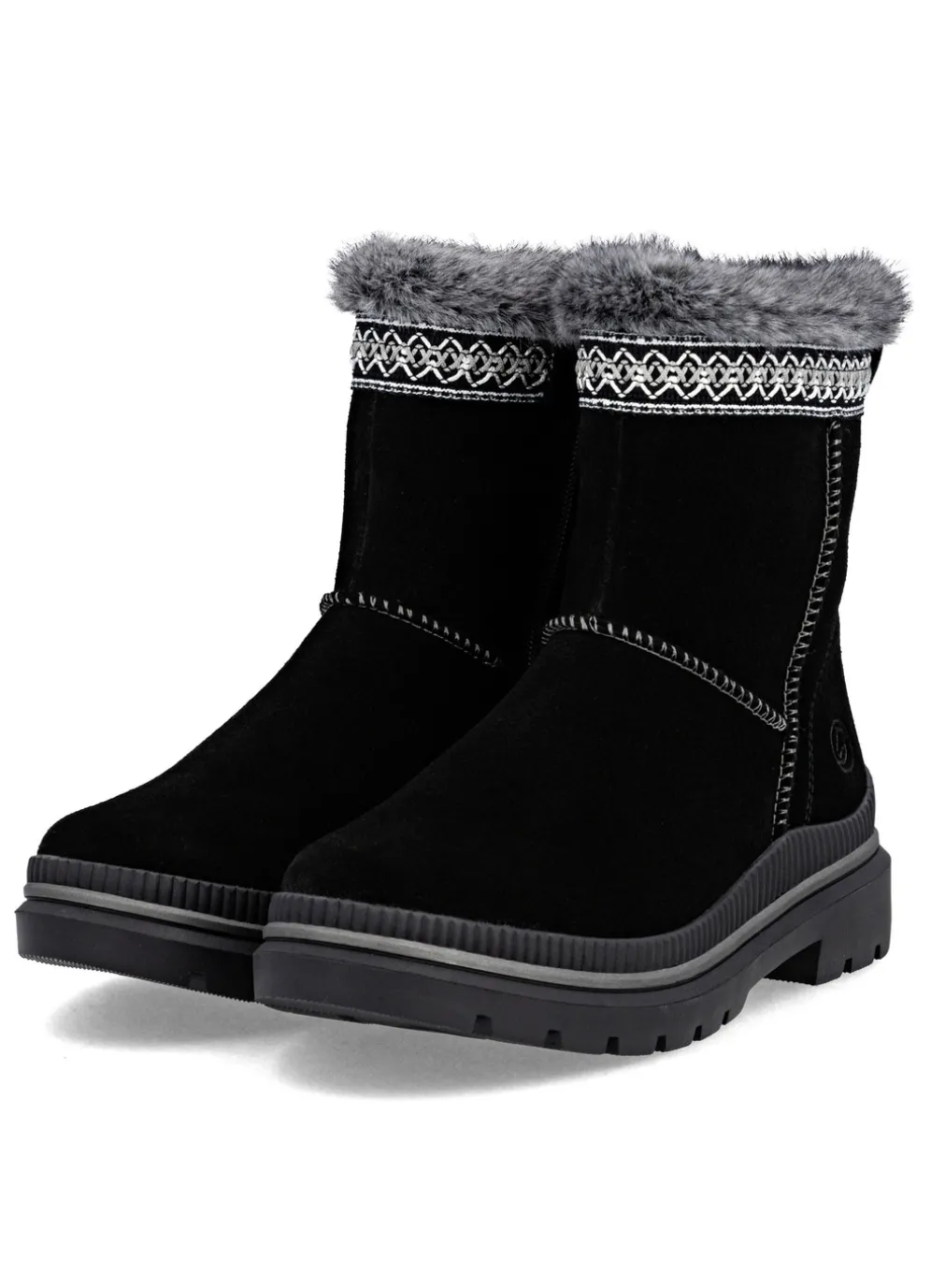 Aktuelle Stiefeletten aus Veloursleder mit gemusterter Bordüre und kuscheligem Plüschkragen: Weite G, Innenreißverschluss, Warmfutter aus echtem Lammfell, warme Decksohle, leichte TR-Profilsohle sowie 20 mm Absatz. Schafthöhe ca. 16 cm