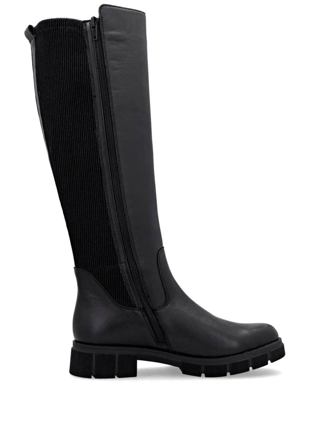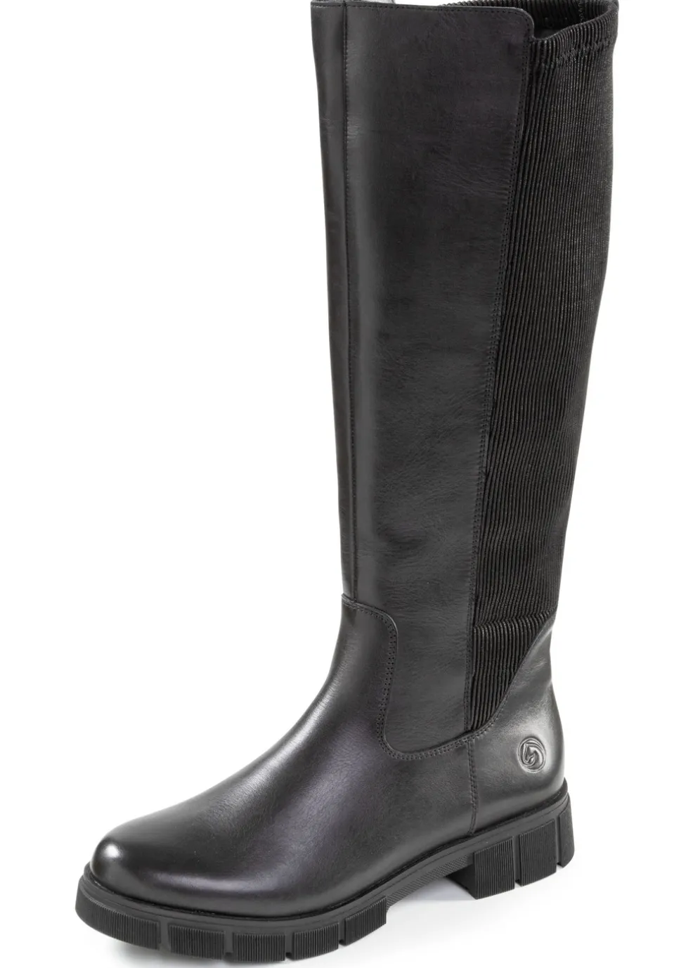 Schwarze Stiefel aus Nappaleder mit dehnbarem Schaft aus Rippstretch: Weite G, Innenreißverschluss, wärmendes Samtfutter, gepolsterte Decksohle, leichte TR-Profilsohle sowie 20 mm Absatz. Schafthöhe ca. 40 cm, Wadenweite ca. 34-38 cm