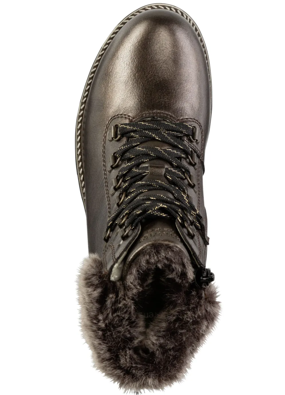 Schnür-Stiefelette aus teilweise schimmerndem Nappaleder mit Plüschkragen: mit Klimamembrane ausgestattet, praktischer Innenreißverschluss, Warmfutter und warme Decksohle, leichte TR-Profilsohle sowie 15 mm Absatz. Schafthöhe ca. 14 cm