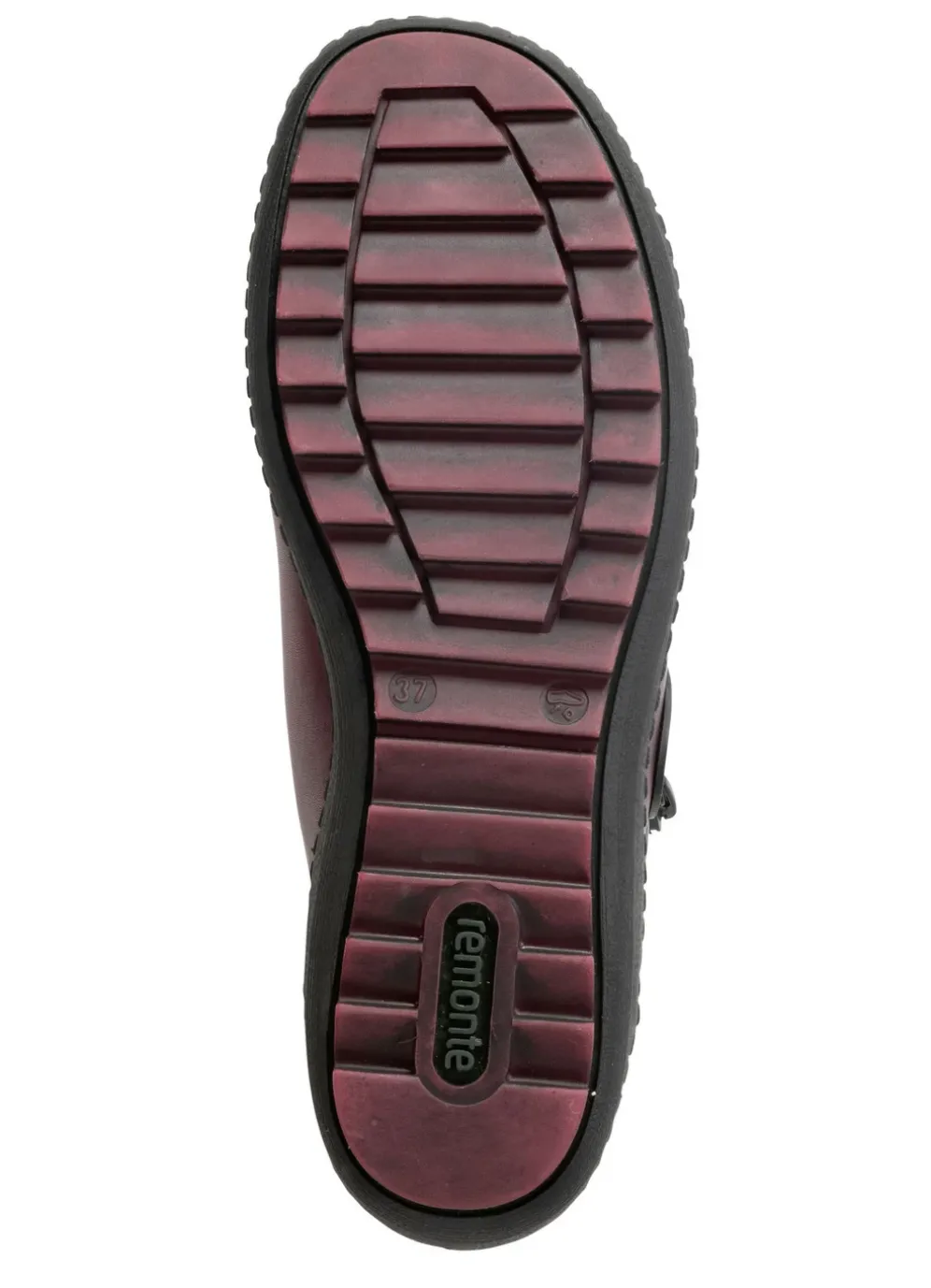 Remonte, sportliche Damen-Boots, Winterschuhe, Weite G, mit herausnehmbarem Fußbett in Bordeaux-Schwarz und in Größe 36.