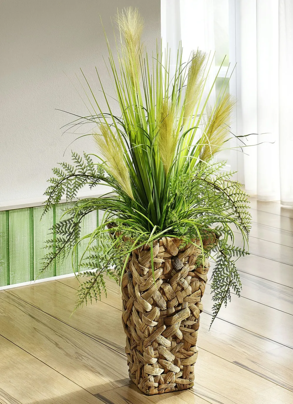 Dieses naturgetreue Gesteck mit täuschend echt wirkendem Riedgras und Farn ist fest in einen Wasserhyazinthentopf eingesetzt. Aus Kunst- und Textilmaterial gefertigt.